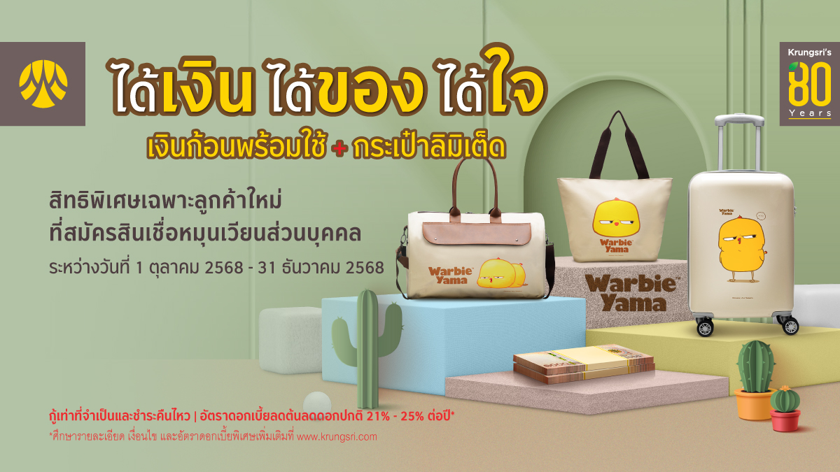 กรุงเทพฯ (3 ตุลาคม 2568) – กรุงศรี (ธนาคารกรุงศรีอยุธยา จำกัด (มหาชน)) มอบสิทธิพิเศษสำหรับลูกค้าใหม่ที่สมัครสินเชื่อหมุนเวียนส่วนบุคคลระหว่างวันที่ 1 ตุลาคม – 31 ธันวาคม 2568 โดยได้รับอนุมัติสินเชื่อ และรับเงินกู้ด้วยวิธีโอนเงินเข้าบัญชีเงินฝากธนาคารกรุงศรีอยุธยา ภายในวันที่ 31 มกราคม 2569 จะได้รับของกำนัลตามวงเงินอนุมัติ ดังนี้