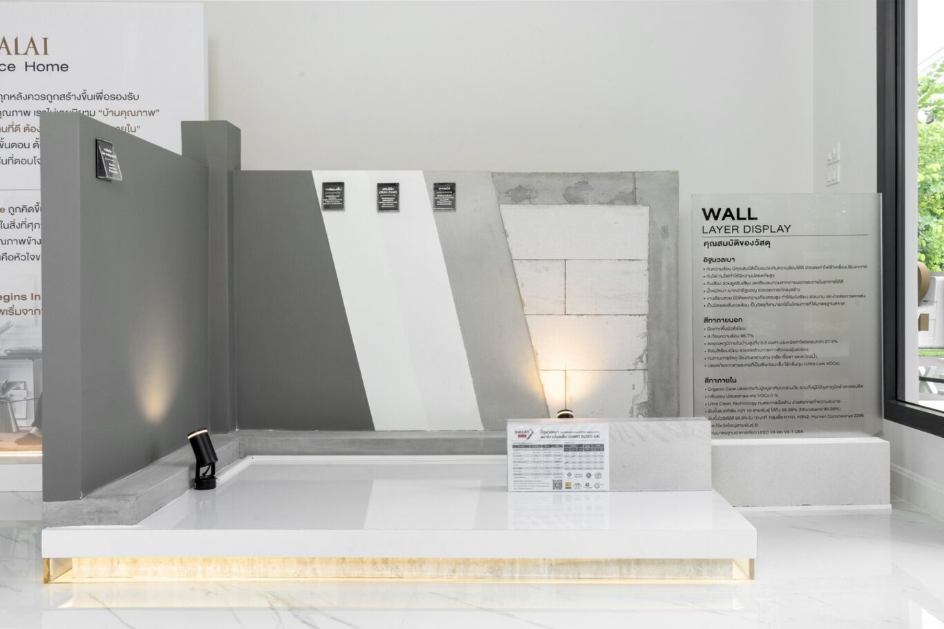 • เจาะลึกโครงสร้างบ้าน – ขั้นตอนการก่อผนังด้วย อิฐมวลเบา ที่มีความแข็งแกร่งแต่น้ำหนักเบา พร้อมคุณสมบัติเป็นฉนวนกันไฟและกันความร้อน ลดการใช้พลังงานไฟฟ้า การก่ออิฐใช้ปูนก่ออัดแน่นเต็มพื้นที่ ไม่มีช่องว่าง เสริมความแข็งแรงด้วยเสาเอ็น คานทับหลัง และลวดตาข่าย ป้องกันการแตกร้าวระหว่างผนังและโครงสร้าง อีกทั้งยังจัดแสดงกระบวนการฉาบผนัง สกิมโค้ท ทาสีรองพื้น และทาสีจริง ที่ปลอดสารระเหย รวมถึงการติดวอลเปเปอร์ ยับยั้งไวรัสและแบคทีเรีย