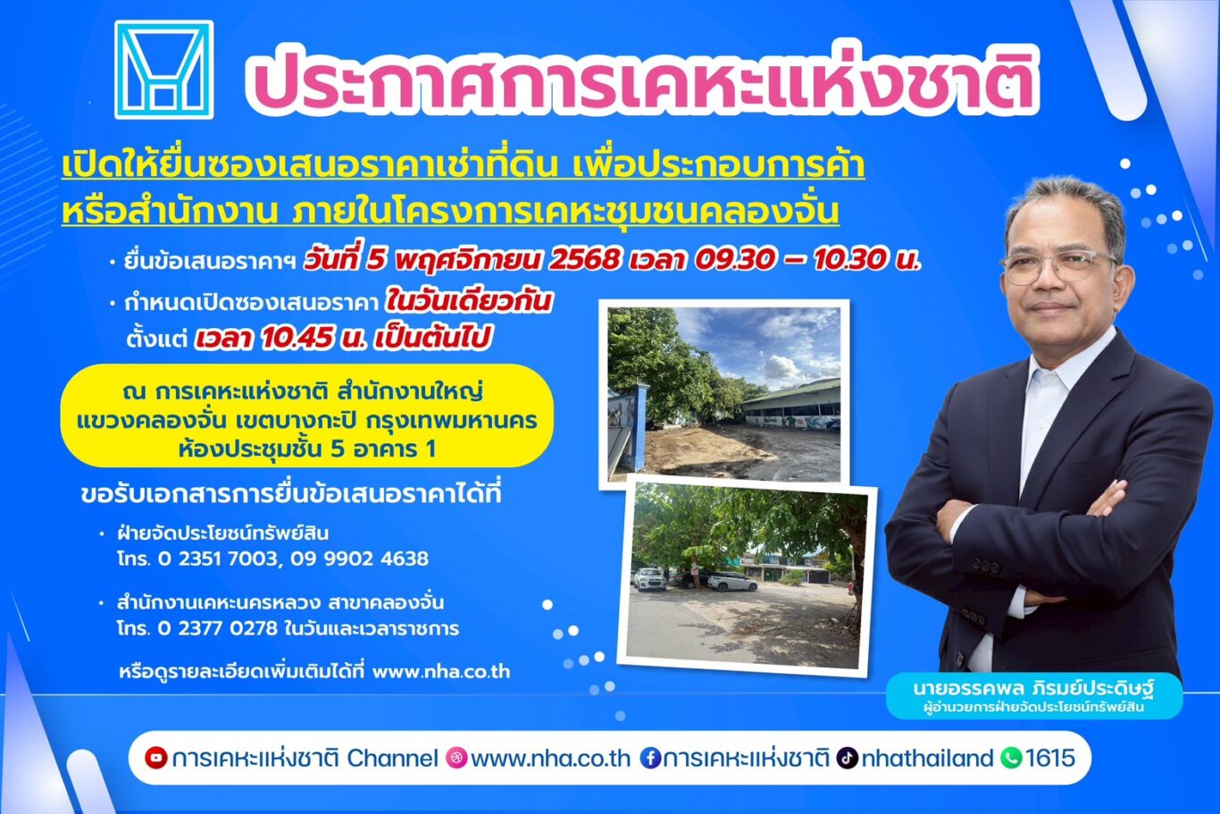 นายอรรคพล ภิรมย์ประดิษฐ์ ผู้อำนวยการฝ่ายจัดประโยชน์ทรัพย์สิน กล่าวว่า การเคหะแห่งชาติเปิดให้เอกชนยื่นซองเสนอราคาค่าธรรมเนียมการได้สิทธิเช่าที่ดิน เพื่อประกอบการค้า หรือสำนักงาน ภายในโครงการเคหะชุมชนคลองจั่น ตั้งอยู่ที่บริเวณซอยนวมินทร์ 49 ถนนนวมินทร์ แขวงคลองจั่น เขตบางกะปิ กรุงเทพฯ ของโฉนดที่ดินเลขที่ 249094 ขนาดเนื้อที่ประมาณ 0-2-40.4 ไร่ และโฉนดที่ดินเลขที่ 249172 ขนาดเนื้อที่ประมาณ 0-1-73.7 ไร่ เนื้อที่เช่ารวม 1-0-14.1 ไร่ เพื่อให้เกิดความโปร่งใสในการดำเนินงานทุกขั้นตอนตามหลักธรรมาภิบาล การเคหะแห่งชาติจึงเปิดโอกาสให้เอกชนที่สนใจสามารถยื่นข้อเสนอราคาการได้สิทธิเช่าที่ดินดังกล่าว โดยมีอัตราค่าธรรมเนียมการได้สิทธิเช่าขั้นต่ำไม่น้อยกว่า 690,000 บาท ระยะเวลาการให้สิทธิเช่า 6 ปี (ทำสัญญาคราวเดียว) ปลอดค่าเช่า 3 เดือน ในอัตราค่าเช่ารายเดือน ปีที่ 1-3 เดือนละ 63,000 บาท ปีที่ 4-6 เดือนละ 73,000 บาท กำหนดหลักประกันการยื่นซองเสนอราคาจำนวน 138,000 บาท กำหนดเงินประกันการปฏิบัติตามสัญญา เป็นเงิน 219,000 บาท โดยกำหนดวันยื่นข้อเสนอราคาฯ ในวันที่ 5 พฤศจิกายน 2568 เวลา 09.30 – 10.30 น. และกำหนดเปิดซองเสนอราคาในวันเดียวกัน ตั้งแต่เวลา 10.45 น. เป็นต้นไป ณ ห้องประชุมชั้น 5 อาคาร 1 สำนักงานใหญ่ การเคหะแห่งชาติ แขวงคลองจั่น เขตบางกะปิ กรุงเทพมหานคร