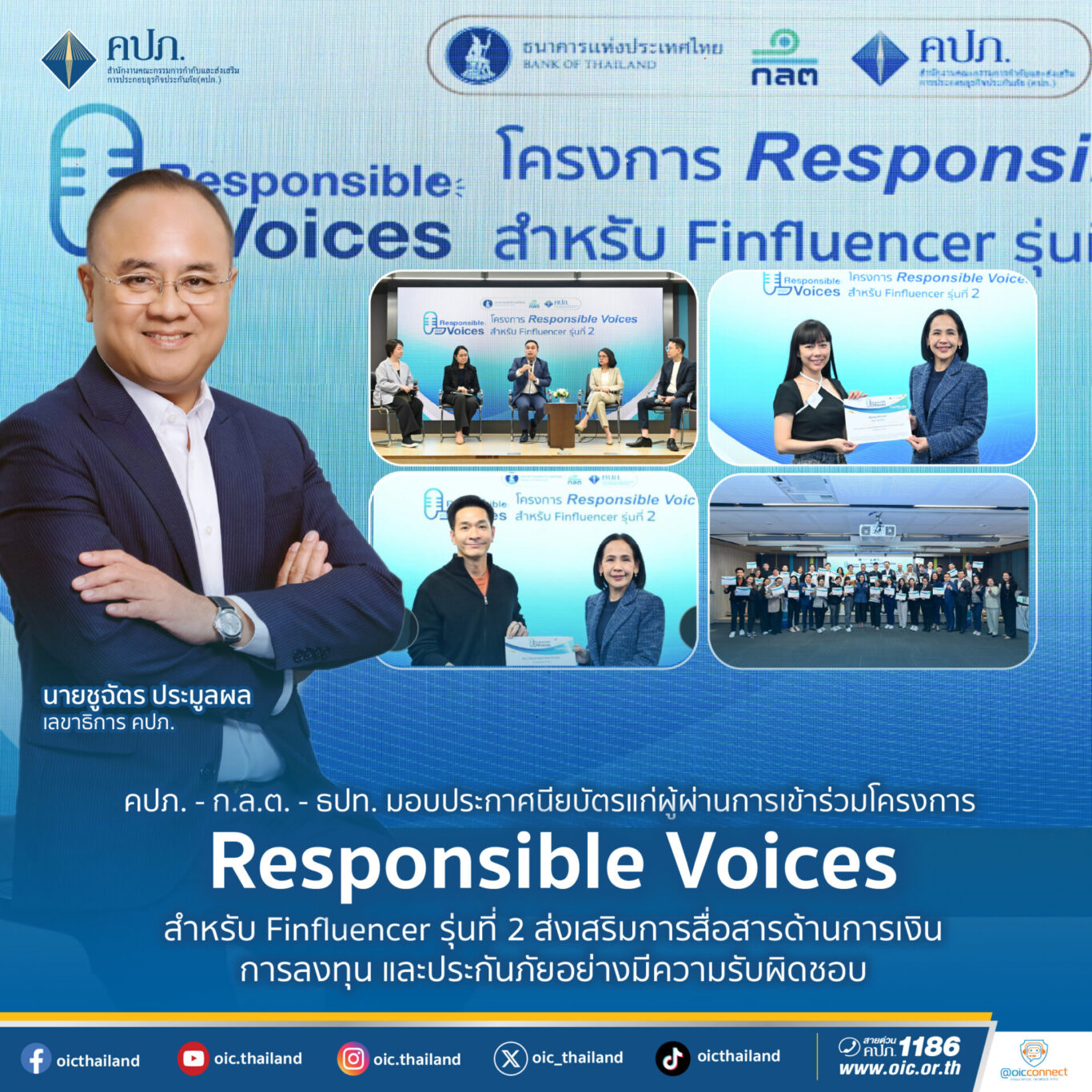 โดยในช่วงของพิธีมอบประกาศนียบัตรแก่ผู้ผ่านการอบรมโครงการ “Responsible Voices สำหรับ Finfluencer รุ่นที่ 2” ได้รับเกียรติจากศาสตราจารย์ ดร.พรอนงค์ บุษราตระกูล เลขาธิการ ก.ล.ต. เป็นประธานมอบประกาศนียบัตรและกล่าวแสดงความยินดีแก่ Finfluencer รุ่นที่ 2 ที่ผ่านการอบรมจำนวน 38 ราย จาก 32 ช่อง พร้อมเน้นย้ำถึงความสำคัญของการสื่อสารด้านการเงิน การลงทุน และประกันภัยอย่างมีความรับผิดชอบในยุคดิจิทัล โดยมุ่งเน้นการเสริมสร้างความรู้ ความเข้าใจเกี่ยวกับแนวทางการเผยแพร่ข้อมูลต่อผู้ติดตามอย่างถูกต้อง เหมาะสม และตระหนักถึงบทบาทของตนในฐานะผู้สร้างสรรค์คอนเทนต์ทางการเงินที่มีจริยธรรม ผ่านรูปแบบการบรรยายและกิจกรรม Workshop จากผู้เชี่ยวชาญของทั้งสามหน่วยงานกำกับดูแล สะท้อนให้เห็นถึงพลังของผู้สร้างคอนเทนต์รุ่นใหม่ ในการใช้สื่อดิจิทัลเผยแพร่ข้อมูลด้านการเงิน การลงทุน และประกันภัยอย่างมีความรับผิดชอบ อันสอดคล้องกับพันธกิจของสำนักงาน คปภ. ในการคุ้มครองผู้ทำประกันภัย และส่งเสริมความรู้ความเข้าใจด้านประกันภัยอย่างยั่งยืน