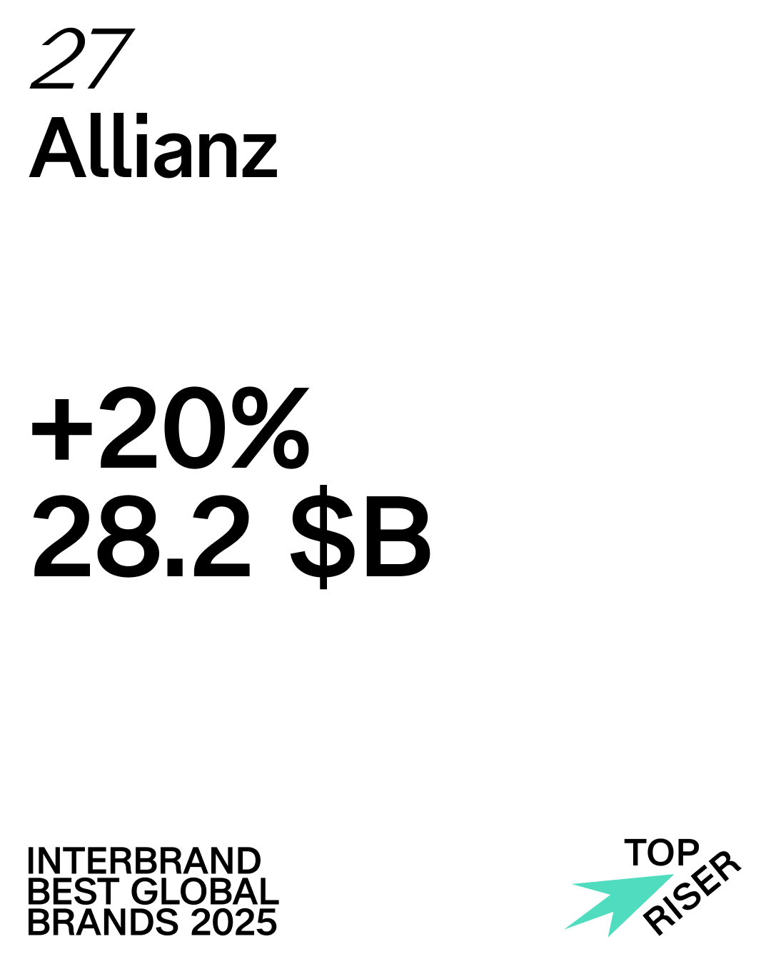 • อลิอันซ์ขยับขึ้น 2 อันดับ มาอยู่อันดับที่ 27 ของแบรนด์ระดับโลก และยังคงครองตำแหน่งแบรนด์ประกันภัยที่มีมูลค่าสูงที่สุดในโลกอีกครั้ง
