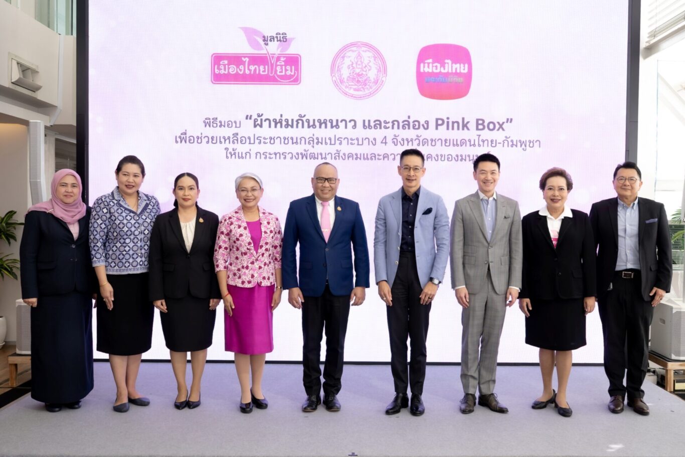 นายสาระ ล่ำซำ ประธานเจ้าหน้าที่บริหาร บริษัท เมืองไทยประกันชีวิต จำกัด (มหาชน) (ที่ 6 จากซ้าย) เปิดเผยว่า บริษัทฯ และมูลนิธิเมืองไทยยิ้มได้ติดตามสถานการณ์ในพื้นที่ชายแดนไทย–กัมพูชา ซึ่งได้รับผลกระทบจากความไม่สงบ รวมถึงภัยหนาวที่กำลังจะมาถึงในปลายปี 2568 พบว่ามีประชาชนจำนวนมากใน 4 จังหวัด ได้แก่ ศรีสะเกษ บุรีรัมย์ สุรินทร์ และสระแก้ว ที่ยังขาดแคลนผ้าห่มและสิ่งของจำเป็นในการรับมือกับสภาพอากาศที่หนาวเย็นดังนั้น เพื่อสนับสนุนภารกิจของกระทรวงการพัฒนาสังคมและความมั่นคงของมนุษย์ ภายใต้แนวนโยบาย “พม.ใกล้คุณ” เมืองไทยประกันชีวิตและมูลนิธิเมืองไทยยิ้ม จึงได้จัดกิจกรรมส่งมอบความช่วยเหลือ ร่วมส่งมอบผ้าห่มกันหนาวจำนวน 500 ผืน และกล่อง “Pink Box” จำนวน 100 ชุด แก่กระทรวงฯ เพื่อกระจายต่อไปยังพี่น้องประชาชนในพื้นที่ที่ได้รับผลกระทบ
