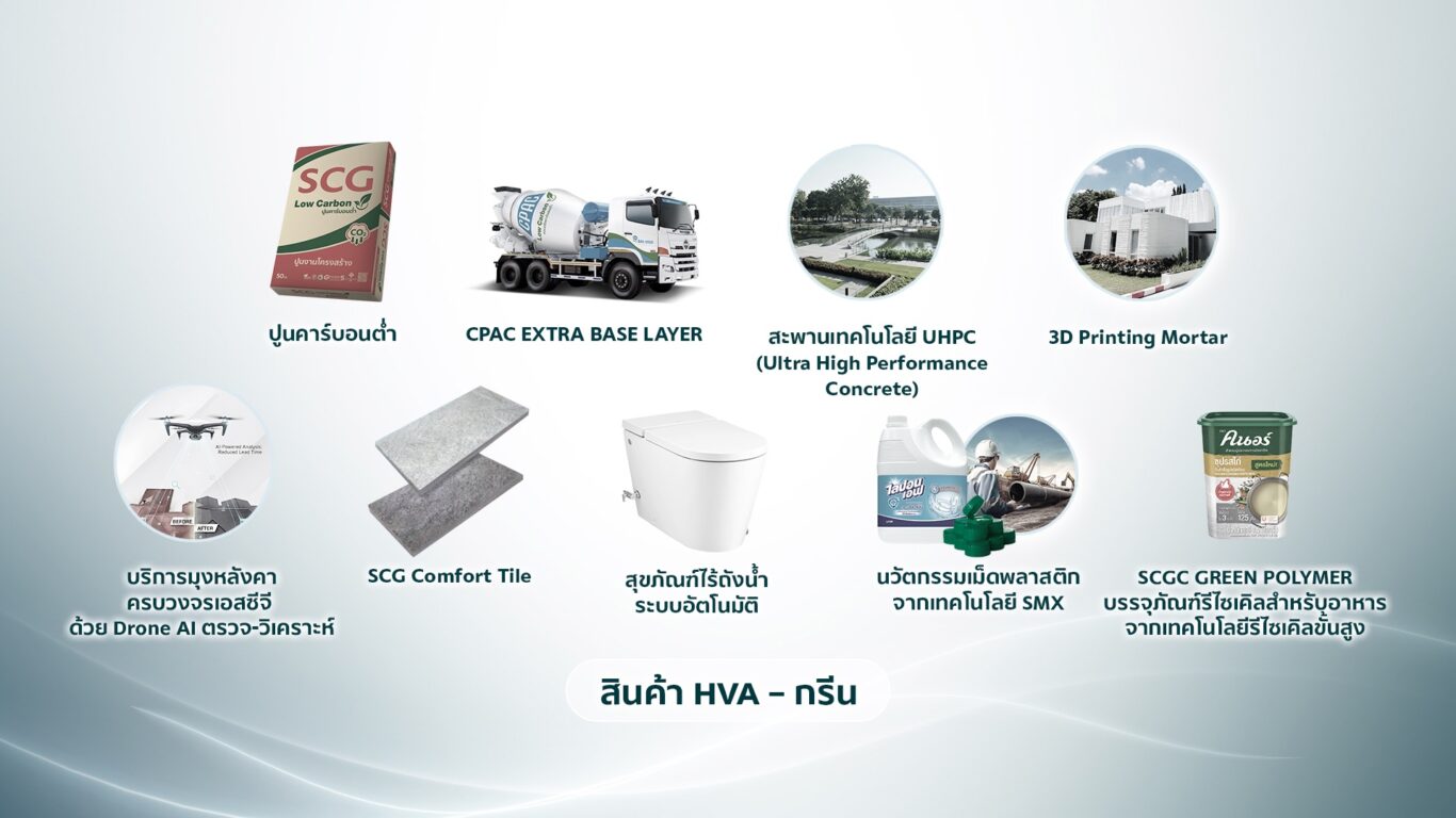 นอกจากนี้ยังมีงานบริการปรับปรุงบ้าน (Home Improvement) จากคิวช่าง อาทิ บริการติดตั้งพื้นไม้ SPC บริการทาสีภายนอก เป็นต้น คาดว่าสินค้ากลุ่มนี้จะได้รับความนิยมสูงในภาวะเศรษฐกิจชะลอตัวต่อเนื่องเร่งเพิ่มกำลังผลิตสินค้ากรีนและสินค้ามูลค่าเพิ่มสูง (High Value Added Products-HVA) อาทิ ปูนคาร์บอนต่ำ ปูนคาร์บอนต่ำ อยู่ระหว่างพัฒนาปูนคาร์บอนต่ำรุ่นใหม่ Generation 3 ที่ลดคาร์บอนไดออกไซด์ได้ถึง 38% โดยเตรียมปรับกำลังการผลิต 2 ล้านตัน/ปี ภายในปี 2570 ที่จ.สระบุรี และ CPAC Extra Base Layer นวัตกรรมซ่อม-สร้างถนนลดการยุบตัวและคงตัวทนนานจากการกัดเซาะน้ำ สะพาน UHPC (Ultra High Performance Concrete) สมรรถนะสูง ลดเวลาก่อสร้างได้ถึง 50% 3D Printing Mortar เทคโนโลยีการขึ้นรูปอาคารก่อสร้างที่มีดีไซน์ซับซ้อน ขยายตลาดไปญี่ปุ่น ซาอุดิอาระเบีย และมาเลเซีย ยกระดับ Roof Installation บริการมุงหลังคาครบวงจรเอสซีจี ด้วย Drone AI ตรวจรอยรั่วหลังคาและวิเคราะห์โครงสร้างแบบ 3 มิติ ช่วยให้ซ่อมแซมรวดเร็ว ปลอดภัย และแม่นยำยิ่งขึ้น SCG Comfort Tile กระเบื้องซีเมนต์ปูพื้นรายแรกในไทย ที่ลดความร้อนสะสมได้ 3–7°C ด้วย HeatSync Technology ให้พื้นเย็น เดินสบาย สุขภัณฑ์ไร้ถังประหยัดน้ำ DUACT และแบบ “เคลือบจากเปลือกไข่–หอย” ลดการปล่อยก๊าซเรือนกระจก นวัตกรรมเม็ดพลาสติกจากเทคโนโลยี SMX ช่วยลดความหนาของผลิตภัณฑ์ลงโดยยังคงความแข็งแรง พัฒนาเป็นสินค้าหลากหลาย เช่น ท่ออุตสาหกรรมเหมืองแร่ขนาดใหญ่ ฝาขวดน้ำอัดลม ถังบรรจุสารเคมี และบรรจุภัณฑ์สินค้าอุปโภคบริโภค นวัตกรรมพลาสติกรีไซเคิล ทั้งเทคโนโลยีรีไซเคิลเชิงกล และเทคโนโลยีรีไซเคิลขั้นสูง ซึ่งใช้ผลิตเป็นบรรจุภัณฑ์ Food Grade ปลอดภัย ผ่านการรับรองมาตรฐาน ISCC PLUS ครอบคลุมตลอดห่วงโซ่อุปทาน