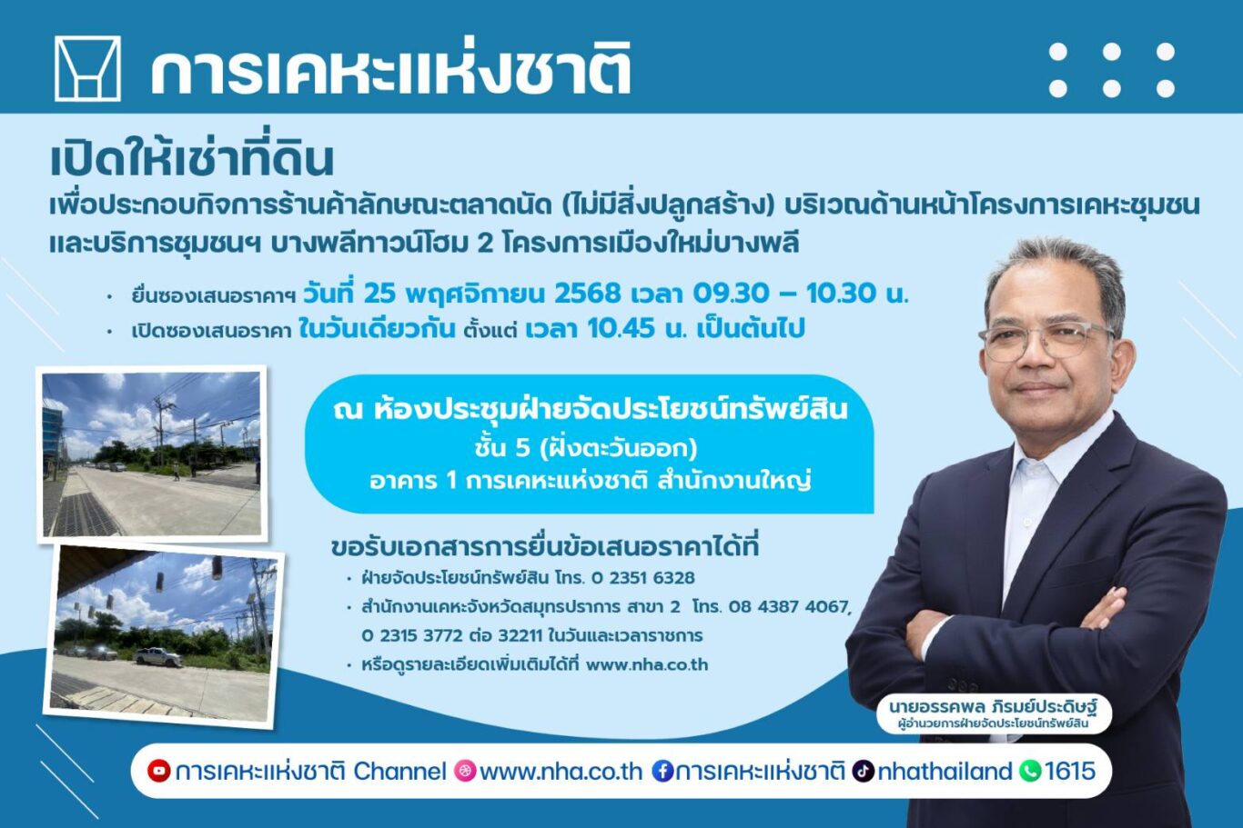 การเคหะแห่งชาติจึงเปิดโอกาสให้เอกชนที่สนใจสามารถยื่นข้อเสนอราคาการได้สิทธิเช่าที่ดินดังกล่าว โดยมีอัตราค่าธรรมเนียมการได้สิทธิเช่าขั้นต่ำไม่น้อยกว่า 600,000 บาท ระยะเวลาการให้สิทธิเช่า 3 ปี (ทำสัญญาคราวเดียว) ในอัตราค่าเช่ารายเดือน ปีที่ 1 เดือนละ 77,200 บาท (ปลอดค่าเช่า 3 เดือนแรก) ปีที่ 2 เดือนละ 79,600 บาท ปีที่ 3 เดือนละ 82,000 บาท กำหนดหลักประกันการยื่นซองเสนอราคาจำนวน 100,000 บาท กำหนดเงินประกันการปฏิบัติตามสัญญา จำนวน 3 เท่าของค่าเช่ารายเดือนปีสุดท้าย เป็นเงิน 246,000 บาท โดยกำหนดวันยื่นข้อเสนอราคาฯ ในวันที่ 25 พฤศจิกายน 2568 เวลา 09.30 – 10.30 น. และกำหนดเปิดซองเสนอราคาในวันเดียวกัน ตั้งแต่เวลา 10.45 น. เป็นต้นไป ณ ห้องประชุมฝ่ายจัดประโยชน์ทรัพย์สิน ชั้น 5 (ฝั่งตะวันออก) อาคาร 1 การเคหะแห่งชาติ แขวงคลองจั่น เขตบางกะปิ กรุงเทพมหานคร