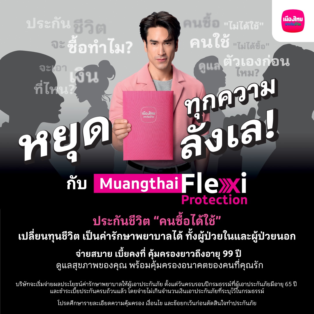 เมืองไทยประกันชีวิต เข้าใจทุกความลังเล และขอ “หยุดทุกความลังเลในหัว” เปิดตัว “Muangthai Flexi Protection” (เมืองไทย เฟล็กซี่ โพรเทคชั่น) ประกันชีวิตที่ “คนซื้อได้ใช้” ให้คุณดูแลสุขภาพของคุณ พร้อมคุ้มครองอนาคตของคนที่คุณรักได้ในกรมธรรม์เดียว สามารถเปลี่ยนทุนชีวิตมาใช้เป็นค่ารักษาในวัยเกษียณได้ทั้งผู้ป่วยใน และผู้ป่วยนอก ทุนประกันที่เหลือส่งต่อให้คนข้างหลังได้ในวันที่คุณไม่อยู่ ตอบทุกเสียงลังเลของคนยุคใหม่ที่ต้องการความคุ้มค่าและยืดหยุ่นในชีวิต ปักธงประกันชีวิตที่ “คนซื้อได้ใช้จริง”