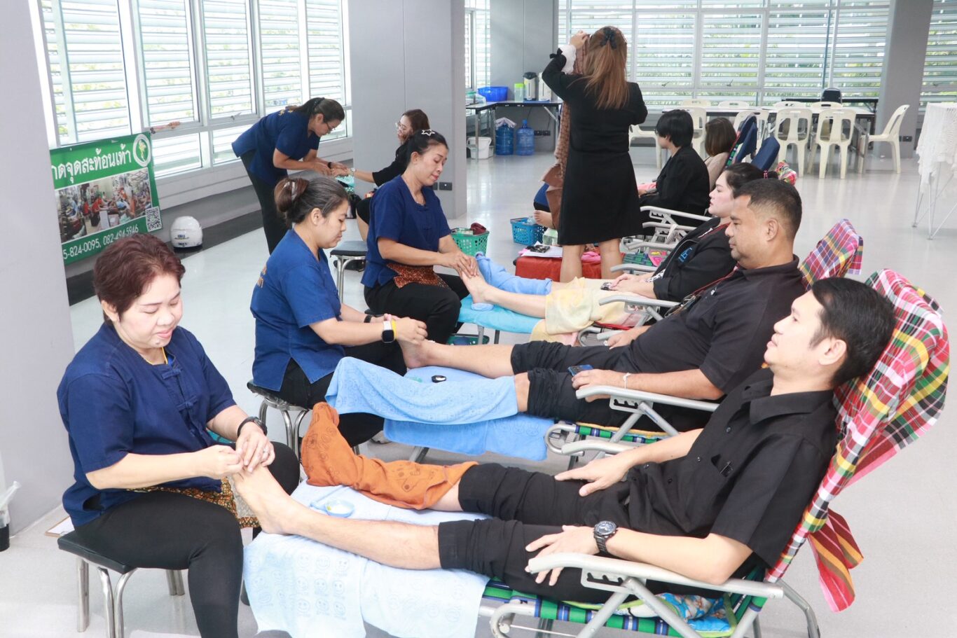 ในส่วนของกิจกรรมด้านกาย มีการให้บริการนวดผ่อนคลายจุดสะท้อนเท้า คอ บ่า ไหล่ ตลอดทั้งวัน ณ ห้องโถงชั้น 2 อาคาร 6 เพื่อช่วยลดอาการเมื่อยล้าและฟื้นฟูสุขภาพ โดยวิสาหกิจชุมชนกลุ่มนวดกดจุดสะท้อนเท้า จากโครงการบ้านเอื้ออาทร เพชรเกษม 81 หนองแขม