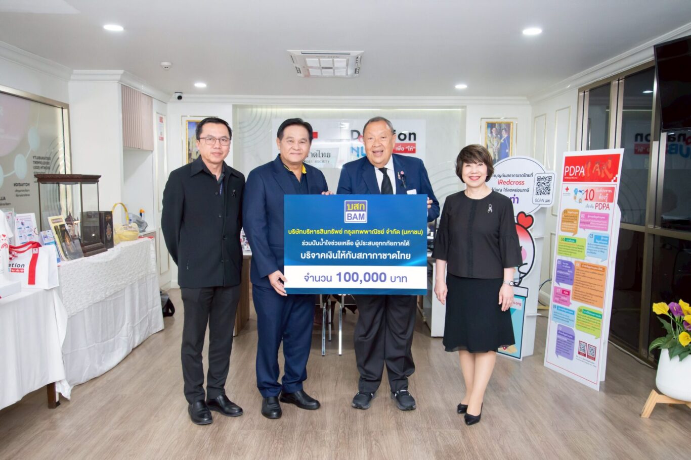สมพร มูลศรีแก้ว ผู้จัดการใหญ่ สายธุรกิจ วุฒิพงศ์ บุญยะสิทธิ์ ผู้ช่วยประธานเจ้าหน้าที่บริหาร สายพัฒนาสินทรัพย์ภูมิภาค 2 บริษัทบริหารสินทรัพย์ กรุงเทพพาณิชย์ จำกัด (มหาชน) หรือ BAM มอบเงินสมทบโครงการปันน้ำใจช่วยเหลือผู้ประสบอุทกภัยในพื้นที่ภาคใต้ ให้กับ สภากาชาดไทย จำนวน 100,000 บาท โดยมี ขรรค์ ประจวบเหมาะ ผู้อำนวยการสำนักงานจัดหารายได้ และ จันทร์ประภา วิชิตชลชัย รองผู้อำนวยการสำนักงานจัดหารายได้ เป็นผู้แทนรับมอบ ณ สำนักงานจัดหารายได้ สภากาชาดไทย