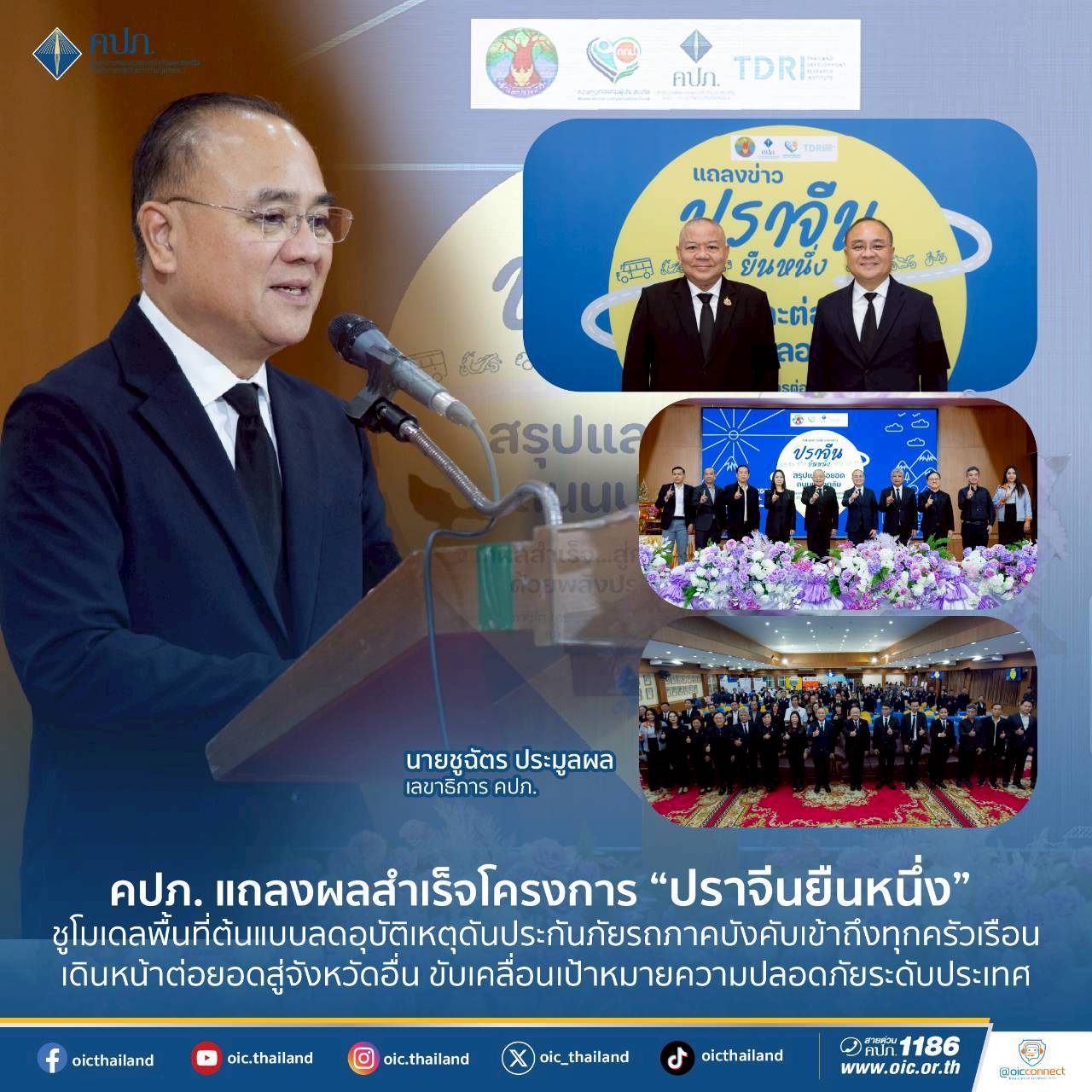 เมื่อวันที่ 28 พฤศจิกายน 2568 สำนักงานคณะกรรมการกำกับและส่งเสริมการประกอบธุรกิจประกันภัย (สำนักงาน คปภ.) นำโดย นายชูฉัตร ประมูลผล เลขาธิการ คปภ. ร่วมกับ จังหวัดปราจีนบุรี ภาคธุรกิจประกันภัย และสถาบันวิจัยเพื่อการพัฒนาประเทศไทย (ทีดีอาร์ไอ) จัดงานแถลงข่าวผลสำเร็จ “ปราจีนยืนหนึ่ง สรุปและต่อยอดถนนปลอดภัย… “จากผลสำเร็จ…สู่การ ต่อยอดถนนปลอดภัย ด้วยพลังประกันภัยรถภาคบังคับ” ณ วิทยาลัยเทคนิคปราจีนบุรี