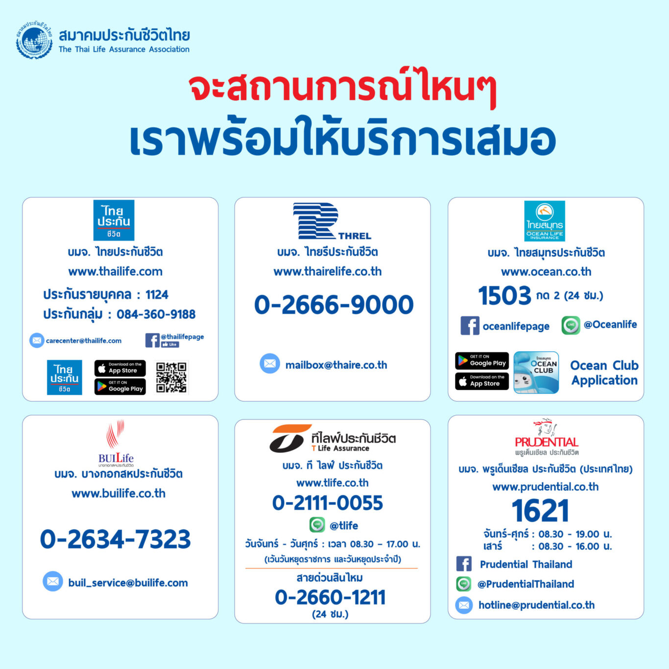 ต้องการสอบถามข้อมูล หรือขอคำแนะนำเกี่ยวกับกรมธรรม์หรือความคุ้มครอง สามารถติดต่อสอบถามได้ที่สมาคมประกันชีวิตไทย ผ่านช่องทาง Facebook : สมาคมประกันชีวิตไทย และทางโทรศัพท์ 02-679-8080 หรืออีเมล tlaa@tlaa.org