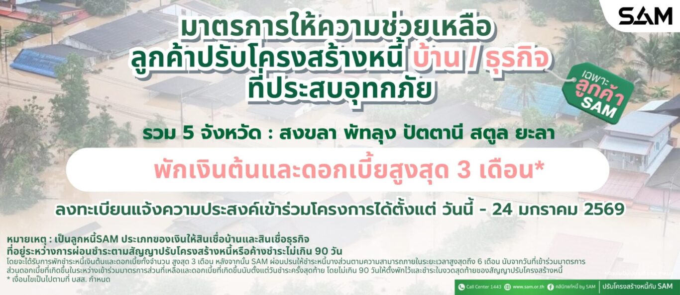 นางสาวนารถนารี รัฐปัตย์ กรรมการผู้จัดการ บริษัท บริหารสินทรัพย์สุขุมวิท จำกัด (บสส.) หรือ SAM เปิดเผยว่า “จากสถานการณ์อุทกภัยที่เกิดขึ้นในพื้นที่ภาคใต้ที่มีความรุนแรงเพิ่มมากขึ้น โดยเฉพาะอำเภอหาดใหญ่และพื้นที่โดยรอบ เหตุการณ์น้ำท่วมครั้งนี้ได้สร้างความเสียหายต่อบ้านเรือน พื้นที่การประกอบอาชีพ อีกทั้งยังส่งผลกระทบต่อการดำเนินชีวิตประชาชนในพื้นที่เป็นวงกว้าง SAM ในฐานะหน่วยงานภาครัฐที่มุ่งสนับสนุนให้ประชาชนและภาคธุรกิจฟื้นตัวอย่างยั่งยืน ได้เร่งออกมาตรการให้ความช่วยเหลือและบรรเทาความเดือดร้อนให้กับลูกค้าปรับโครงสร้างหนี้ของ SAM ที่ได้รับผลกระทบจากสาธารณภัยตามพื้นที่ประสบสาธารณภัย 5 จังหวัด ได้แก่ สงขลา พัทลุง ปัตตานี สตูล และ ยะลา ตามประกาศของกรมป้องกันและบรรเทาสาธารณภัย (ปภ.)”