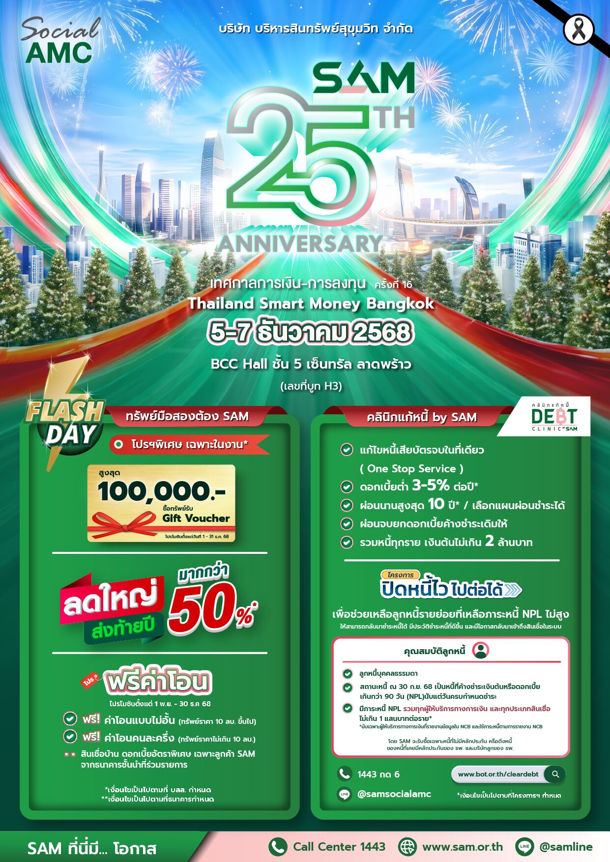 SAM ลดใหญ่ทรัพย์ NPA มากกว่า 50% ร่วมงาน “เทศกาลการเงิน-การลงทุน ครั้งที่ 16 Thailand Smart Money 2025” เซ็นทรัลลาดพร้าว 5-7 ธ.ค. 68 ชูบทบาท Social AMC พร้อมมาตรการพิเศษช่วยลูกค้าปรับโครงสร้างหนี้ บ้าน/ธุรกิจ NPL และ “คลินิกแก้หนี้ by SAM” ช่วยแก้หนี้เสียสารพัดบัตร