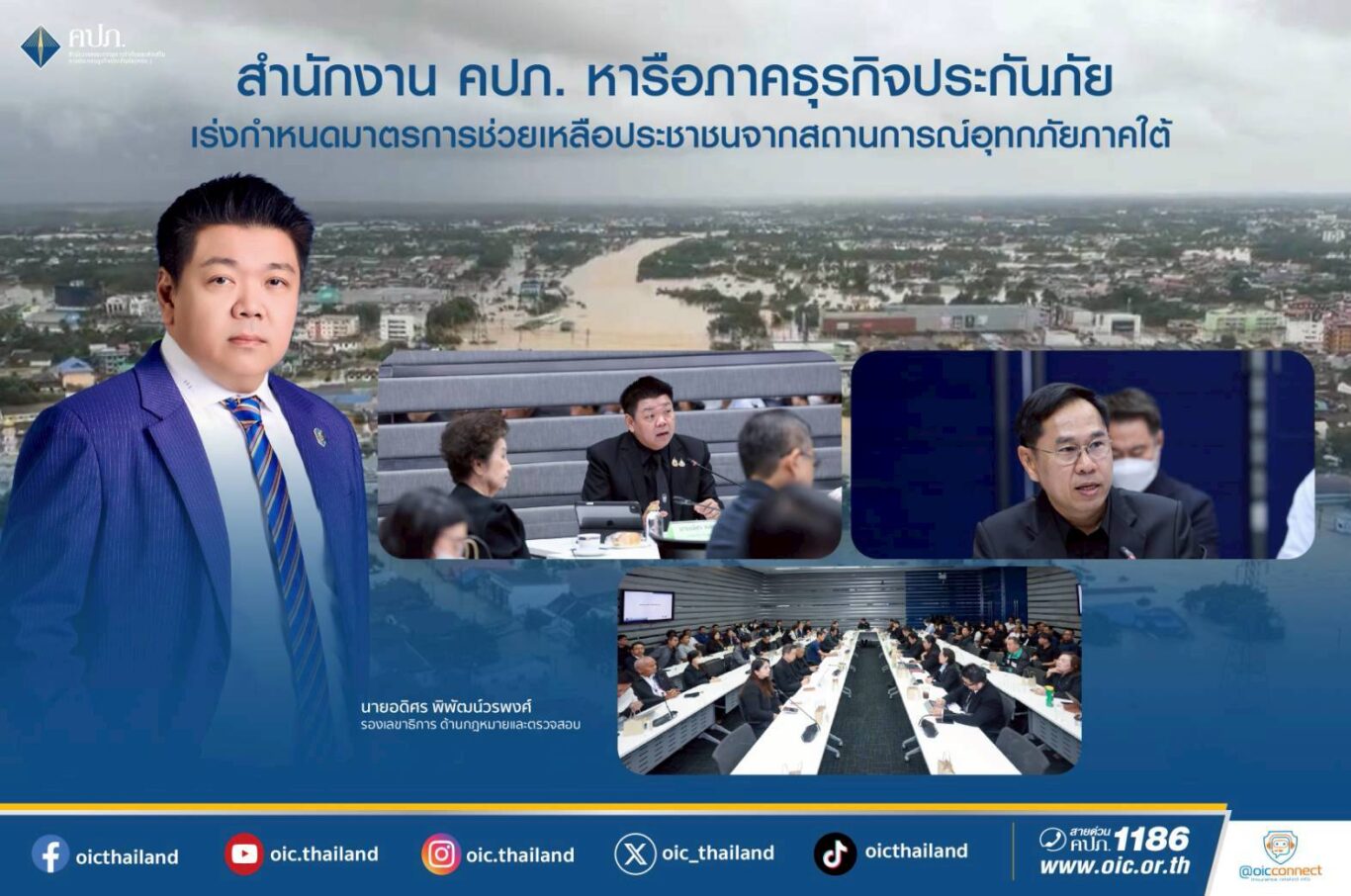เมื่อวันที่ 3 ธันวาคม 2568 นายชูฉัตร ประมูลผล เลขาธิการคณะกรรมการกำกับและส่งเสริมการประกอบธุรกิจประกันภัย (เลขาธิการ คปภ.) มอบหมายให้ นายอดิศร พิพัฒน์วรพงศ์ รองเลขาธิการ ด้านกฎหมายและตรวจสอบ เป็นประธานการประชุม โดยมี นายคณานุสรณ์ เที่ยงตระกูล ผู้ช่วยเลขาธิการ สายคุ้มครองสิทธิประโยชน์ พร้อมผู้แทนจากภาคธุรกิจประกันภัย และหน่วยงานที่เกี่ยวข้องเข้าร่วมประชุม เพื่อ “กำหนดมาตรการช่วยเหลือประชาชนจากสถานการณ์อุทกภัยภาคใต้” ณ ห้องประชุมสถาบันวิทยาการประกันภัยระดับสูง ชั้น 2 สำนักงาน คปภ. ถนนรัชดาภิเษก