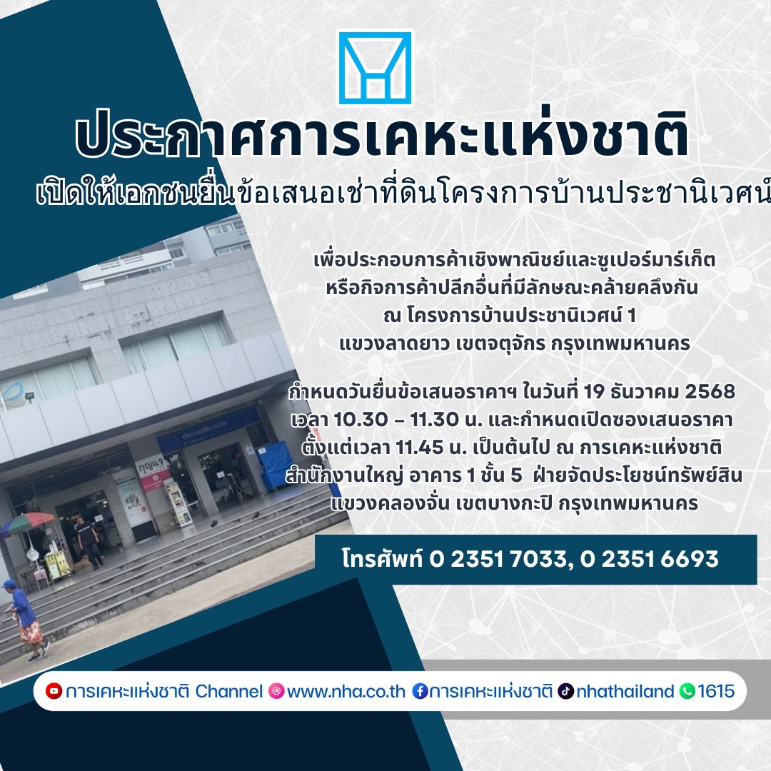 การเคหะแห่งชาติจึงเปิดโอกาสให้เอกชนที่สนใจสามารถยื่นข้อเสนอราคาการได้สิทธิเช่าที่ดินดังกล่าว โดยมีอัตราค่าธรรมเนียมการได้สิทธิเช่าขั้นต่ำ 5,800,000 บาท ระยะเวลาการให้สิทธิเช่า 15 ปี (ทำสัญญาคราวเดียว) ในอัตราค่าเช่ารายเดือน ปีที่ 1-3 เดือนละ 210,000 บาท (ปลอดค่าเช่า 3 เดือนแรก) ปีที่ 4-6 เดือนละ 250,000 บาท ปีที่ 7-9 เดือนละ 290,000 บาท ปีที่ 10-12 เดือนละ 340,000 บาท ปีที่ 13-15 เดือนละ 400,000 บาท กำหนดหลักประกันการยื่นซองเสนอราคาจำนวน 100,000 บาท กำหนดเงินประกันการปฏิบัติตามสัญญา จำนวน 1,200,000 บาท โดยกำหนดวันยื่นข้อเสนอราคาในวันที่ 19 ธันวาคม 2568 เวลา 10.30 – 11.30 น. และกำหนดเปิดซองเสนอราคา ตั้งแต่เวลา 11.45 น. เป็นต้นไป ณ การเคหะแห่งชาติ สำนักงานใหญ่ อาคาร 1 ชั้น 5 ฝ่ายจัดประโยชน์ทรัพย์สิน แขวงคลองจั่น เขตบางกะปิ กรุงเทพมหานคร
