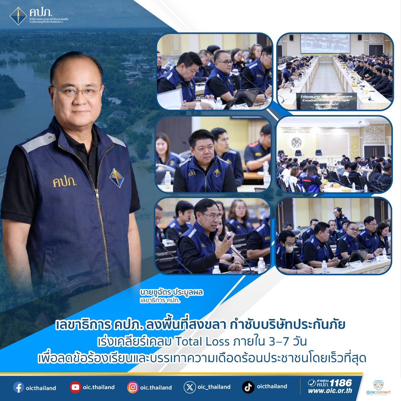 เมื่อวันที่ 12 ธันวาคม 2568 นายชูฉัตร ประมูลผล เลขาธิการคณะกรรมการกำกับและส่งเสริมการประกอบธุรกิจประกันภัย (เลขาธิการ คปภ.) พร้อมด้วยคณะผู้บริหารและพนักงาน สำนักงาน คปภ. ได้ลงพื้นที่จังหวัดสงขลา เพื่อเข้าร่วมการประชุมร่วมกับผู้บริหารระดับสูงของบริษัทประกันภัย เพื่อหารือแนวทางการแก้ไขปัญหาอุทกภัยในพื้นที่ภาคใต้ เป็นการเร่งด่วน ณ ศาลากลางจังหวัดสงขลา