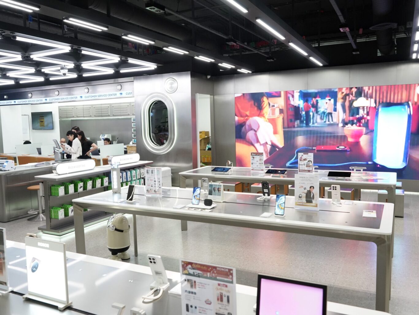 HONOR Authorized Service Center ได้รับการออกแบบภายใต้แนวคิด “The Coexistence of Technology and Humanity” หรือการอยู่ร่วมกันอย่างกลมกลืนระหว่างเทคโนโลยีและมนุษยธรรม โดยอ้างอิงมาตรฐานการออกแบบค้าปลีก HONOR SI 4.0 ที่มีความทันสมัยในระดับสากล ผสานกลิ่นอายของวัฒนธรรมท้องถิ่นอย่างมีเอกลักษณ์ โดดเด่นด้วยการตกแต่งที่ได้รับแรงบันดาลใจจากอาคาร คิง เพาเวอร์ มหานคร แลนด์มาร์คสำคัญของกรุงเทพมหานคร ถ่ายทอดผ่านเพดานไฟลวดลายเรขาคณิตที่สื่อถึงความล้ำสมัย ซึ่งภายในศูนย์บริการแบ่งพื้นที่ใช้งานอย่างเป็นสัดส่วน เพื่อรองรับประสบการณ์ของผู้ใช้งานในทุกมิติ ไม่ว่าจะเป็นพื้นที่รับรองลูกค้า เคาน์เตอร์บาร์ โซนสาธิตผลิตภัณฑ์ และพื้นที่กิจกรรม โดยออกแบบให้การเคลื่อนย้ายระหว่างโซนจัดแสดงสินค้าและโซนบริการหลังการขายเป็นไปอย่างต่อเนื่อง ไร้รอยต่อ สร้างบรรยากาศเรียบหรู ทันสมัย ด้วยวัสดุสแตนเลสและระบบ Dynamic Lighting ที่ช่วยเพิ่มมิติให้กับพื้นที่อีกหนึ่งไฮไลต์สำคัญคือการนำ เทคโนโลยี AI มาช่วยยกระดับการให้บริการ อาทิ หุ่นยนต์ต้อนรับอัจฉริยะ สำหรับจัดคิวและให้ข้อมูลเบื้องต้นอย่างแม่นยำ รวมถึงโซนสาธิตผลิตภัณฑ์ IoT ที่แสดงศักยภาพของการเชื่อมต่ออุปกรณ์อัจฉริยะ เช่น กีตาร์อัจฉริยะ และอุปกรณ์สุขภาพที่สามารถซิงค์ข้อมูลแบบเรียลไทม์ สะท้อนวิสัยทัศน์ของ HONOR ในการสร้างระบบนิเวศอัจฉริยะที่ตอบโจทย์ไลฟ์สไตล์ดิจิทัลยุคใหม่