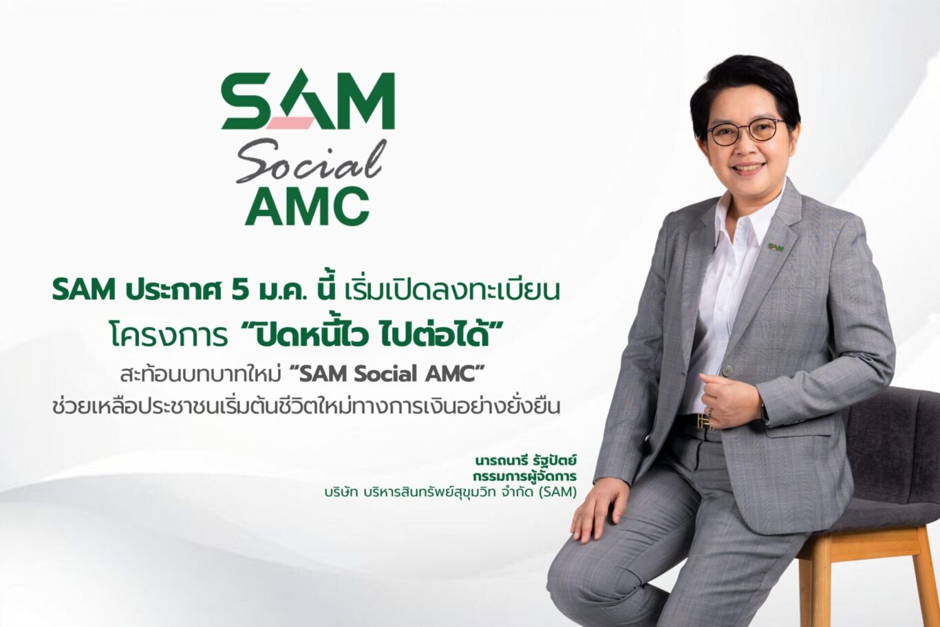 “ถือเป็นก้าวสำคัญที่สะท้อนให้เห็นถึงบทบาท บริษัทบริหารสินทรัพย์เพื่อสังคม หรือ Social AMC ของ SAM ที่สามารถเริ่มดำเนินการให้เห็นอย่างเป็นรูปธรรมและรวดเร็ว และนับจากวันนี้การปรับโครงสร้างหนี้ของ SAM ไม่ใช่การทวงหนี้ หรือบริหารจัดการหนี้เพื่อผลกำไรหรือประโยชน์ทางธุรกิจ แต่เป็นการมองหนี้ในมิติของสังคมควบคู่กัน และนี่คือบทบาทของ บริษัทบริหารสินทรัพย์เพื่อสังคม หรือ Social AMC ที่เป็นกลไกกลางของภาครัฐในการแก้ไขปัญหาหนี้เชิงโครงสร้างอย่างเป็นระบบ ภายใต้นโยบายที่ชัดเจน เพื่อพลิกฟื้นชีวิตทางการเงินและช่วยเหลือให้คนไทยนับล้านคนกลับมาตั้งตัวและเดินหน้าต่อไปได้อีกครั้ง ควบคู่กับการลดผลกระทบและความเสี่ยงต่อระบบการเงิน การธนาคารโดยรวม อันจะส่งผลต่อเสถียรภาพและความแข็งแกร่งของเศรษฐกิจไทยในระยะยาว” นางสาวนารถนารี กล่าว