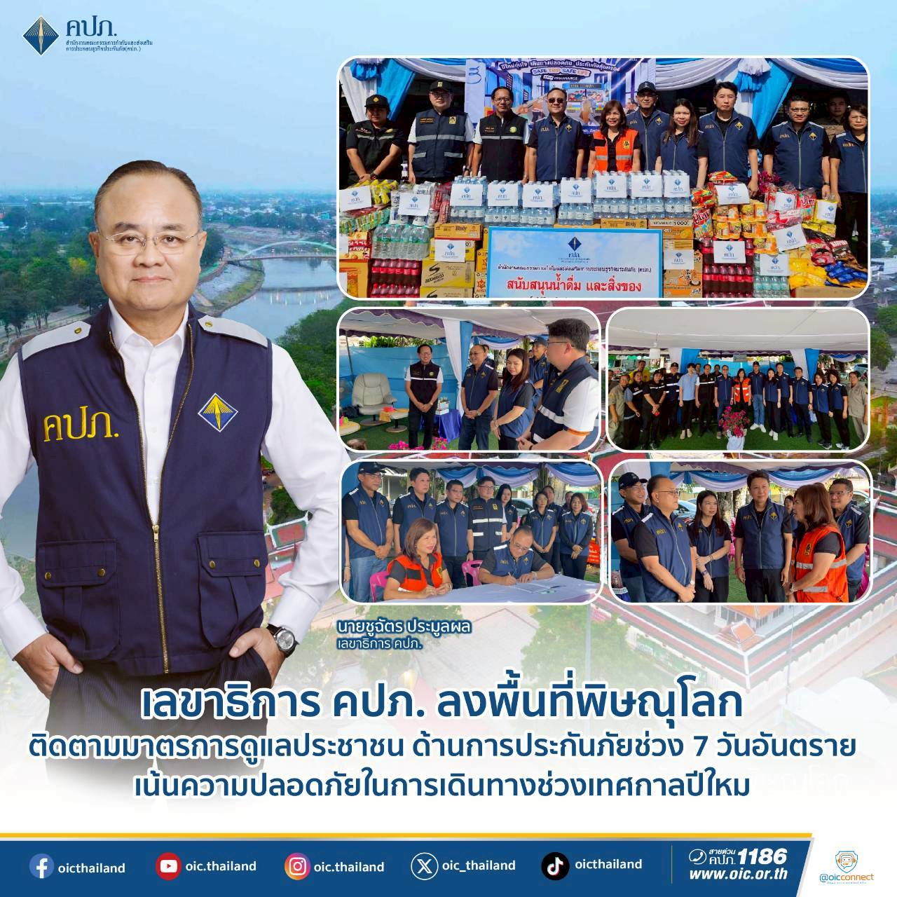 นายชูฉัตร ประมูลผล เลขาธิการคณะกรรมการกำกับและส่งเสริมการประกอบธุรกิจประกันภัย (เลขาธิการ คปภ.) พร้อมคณะ ได้ลงพื้นที่จังหวัดพิษณุโลก เพื่อติดตามสถานการณ์และเตรียมความพร้อมด้านการประกันภัย ในช่วงเทศกาลปีใหม่ ซึ่งเป็นช่วงที่ประชาชนใช้รถใช้ถนนและมีการเดินทางเพิ่มขึ้นกว่าปกติ ในช่วง 7 วันอันตราย ระหว่างวันที่ 30 ธันวาคม 2568 ถึงวันที่ 5 มกราคม 2569 โดยสำนักงาน คปภ. ได้เลือกพื้นที่จังหวัดพิษณุโลกเป็นพื้นที่ติดตามการดูแลประชาชนด้านการประกันภัย เนื่องจากเป็นจังหวัดศูนย์กลางการคมนาคมที่สำคัญของภาคเหนือตอนล่าง และเป็นเส้นทางผ่านหลักที่เชื่อมโยงการเดินทางระหว่างภาคเหนือ ภาคกลาง และภาคตะวันออกเฉียงเหนือ ประกอบกับในช่วงเทศกาลปีใหม่มีปริมาณการจราจรหนาแน่นและมีการเดินทางของประชาชนจำนวนมาก จึงจำเป็นต้องติดตามความพร้อมด้านการประกันภัยและการให้ความช่วยเหลือประชาชนอย่างใกล้ชิด