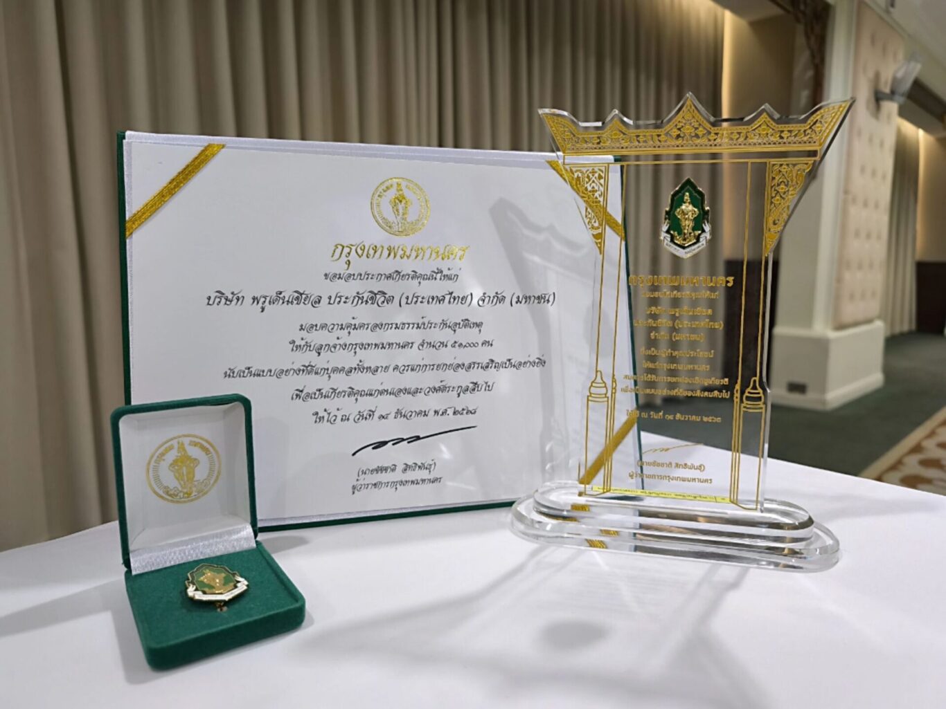 การรับมอบประกาศเกียรติคุณ โล่รางวัล และเข็มเชิดชูเกียรติ ครั้งนี้ ถือเป็นเครื่องหมายที่แสดงถึงความมุ่งมั่นของพรูเด็นเชียลฯ ในการดำเนินธุรกิจควบคู่กับการสร้างคุณค่าแก่สังคมผ่านโครงการ “Give The Future: การให้ที่ยั่งยืน คือ การให้ที่ส่งต่อได้” ด้วยการมอบกรมธรรม์ประกันภัยอุบัติเหตุแก่ลูกจ้างกทม.และลูกจ้างโรงพยาบาลรัฐ จำนวน 80,000 คน ทุนประกันภัยรวม 8,000,000,000 บาท เพื่อส่งเสริมโอกาสและมอบความคุ้มครองด้านประกันชีวิตแก่กลุ่มคนเปราะบาง ซึ่งพรูเด็นเชียลฯ เชื่อว่าการดำเนินธุรกิจที่ดี ไม่ได้เพียงแค่ต้องมีส่วนร่วมในการสร้างสังคมที่ดี แต่ต้องมุ่งสร้าง “การเปลี่ยนแปลงเชิงบวกให้กับสังคม” อีกด้วย