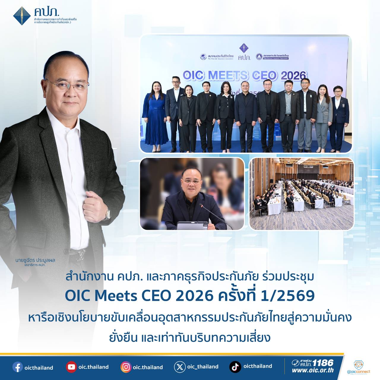 เมื่อวันที่ 5 มกราคม 2569 สำนักงานคณะกรรมการกำกับและส่งเสริมการประกอบธุรกิจประกันภัย (สำนักงาน คปภ.) จัดการประชุมผู้บริหารระดับสูงด้านการประกันภัย “OIC Meets CEO 2026” ครั้งที่ 1/2569 โดย นายชูฉัตร ประมูลผล เลขาธิการคณะกรรมการกำกับและส่งเสริมการประกอบธุรกิจประกันภัย (เลขาธิการ คปภ.) เป็นประธานการประชุมร่วมกับ นางนุสรา (อัสสกุล) บัญญัติปิยพจน์ นายกสมาคมประกันชีวิตไทย ดร.สมพร สืบถวิลกุล นายกสมาคมประกันวินาศภัยไทย และ นายสาระ ล่ำซำ อุปนายกฝ่ายการตลาด สมาคมประกันชีวิตไทย พร้อมด้วยผู้บริหารสำนักงาน คปภ. ผู้บริหารสมาคมประกันชีวิตไทย ผู้บริหารสมาคมประกันวินาศภัยไทย และผู้บริหารบริษัทประกันภัย รวมถึง นายกสมาคมตัวแทนประกันชีวิตและที่ปรึกษาการเงิน และนายกสมาคมนายหน้าประกันภัยไทย เข้าร่วมประชุม ณ ห้องประชุม 421 อาคารอเนกประสงค์ สถาบันวิชาการป้องกันประเทศ กรุงเทพมหานคร