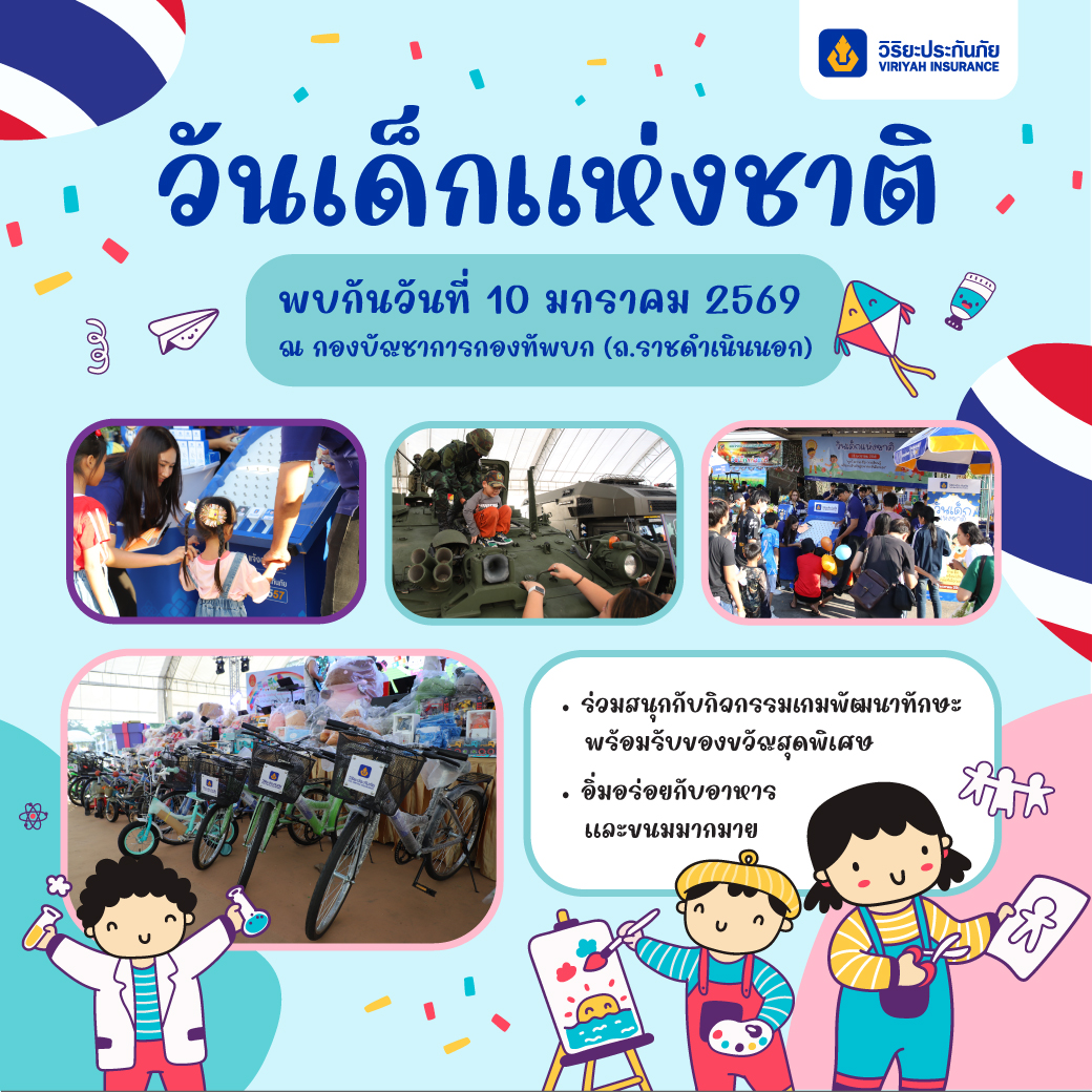 บริษัท วิริยะประกันภัย จำกัด (มหาชน) ร่วมสนับสนุน กองทัพบก (ทบ.) จัดงาน “วันเด็กแห่งชาติ ประจำปี 2569” เพื่อสร้างแรงบันดาลใจให้กับเด็กและเยาวชนได้เรียนรู้อย่างมีความสุข ผ่านกิจกรรมสร้างสรรค์ที่ช่วยเสริมสร้างพัฒนาการทางร่างกาย สติปัญญา และจิตใจ ตลอดจนส่งเสริมความสัมพันธ์อันดีภายในครอบครัว อันเป็นรากฐานสำคัญของการพัฒนาเด็กและเยาวชนให้เติบโตอย่างมีคุณภาพในอนาคต ณ กองบัญชาการกองทัพบก ถนนราชดำเนินกลาง แขวงบางขุนพรหม เขตพระนคร กรุงเทพมหานคร ในวันเสาร์ ที่ 10 มกราคม 2569 ตั้งแต่เวลา 08.00 – 16.00 น.