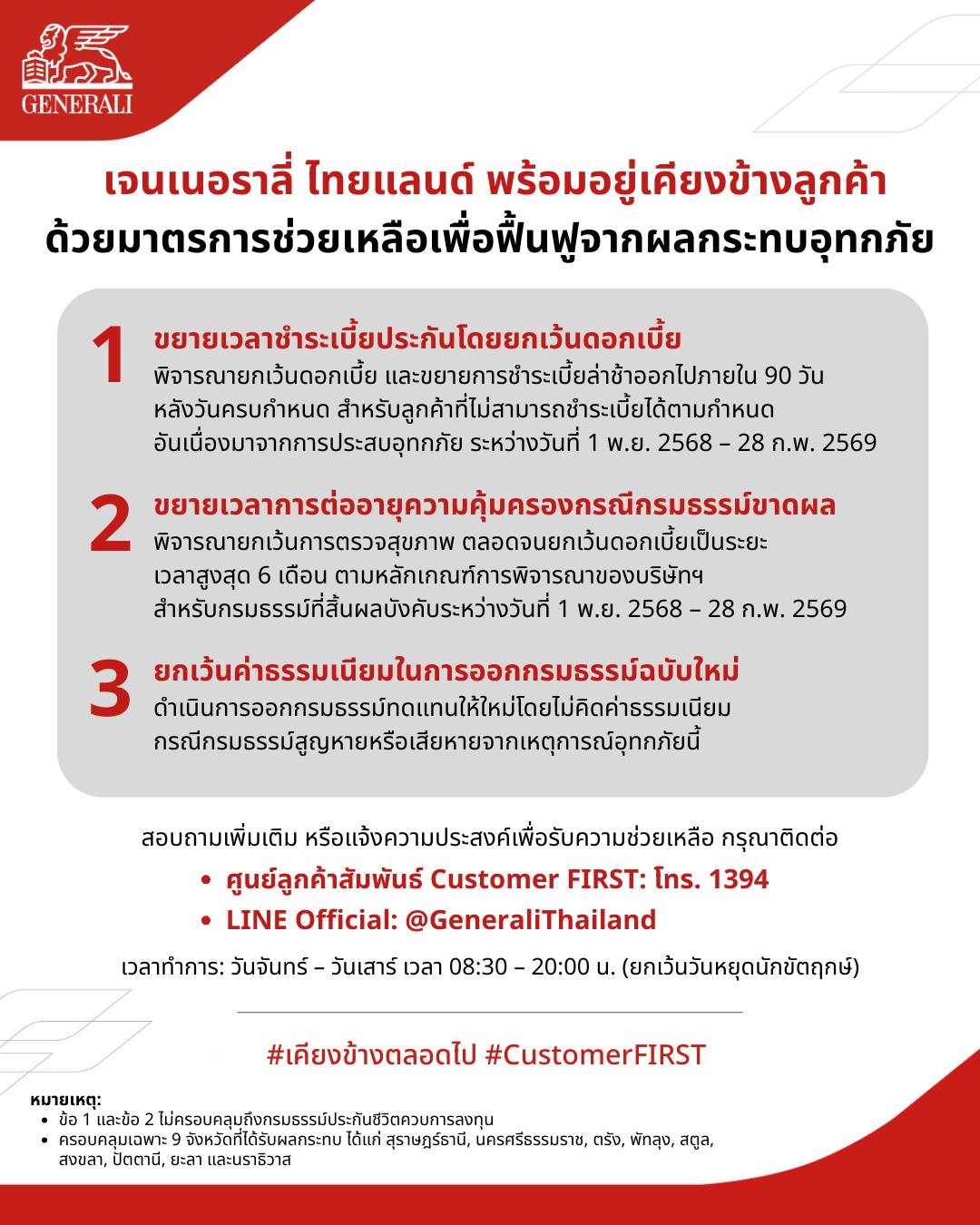 ลูกค้าเจนเนอราลี่ ไทยแลนด์ สามารถสอบถามตัวแทนประกันภัยเรื่องมาตรการให้ความช่วยเหลือ หรือแจ้งความประสงค์เพื่อรับความช่วยเหลือได้ทาง ศูนย์ลูกค้าสัมพันธ์ Customer FIRST : โทร 1394 หรือทาง LINE Official: @GeneraliThailand