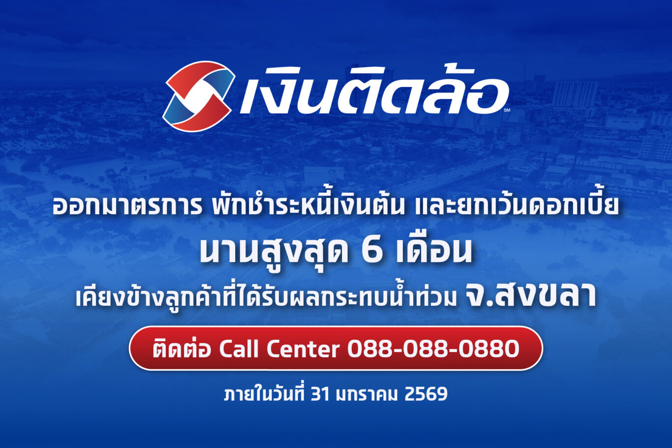 “เงินติดล้อ” ออกมาตรการพักชำระหนี้เงินต้นและยกเว้นดอกเบี้ย ให้กับลูกค้าสินเชื่อที่ได้รับผลกระทบจากเหตุการณ์น้ำท่วมในพื้นที่ จ.สงขลา เป็นระยะเวลานานสูงสุด 6 เดือน โดยลูกค้าสินเชื่อที่ได้รับผลกระทบจากน้ำท่วมในพื้นที่ จ.สงขลา สามารถติดต่อสอบถามมาตรการพักชำระหนี้ภายในวันที่ 31 มกราคม 2569 หรือสอบถามรายละเอียดเพิ่มเติมได้ที่ Call Center หมายเลขโทรศัพท์ 088-088-0880 ตลอด 24 ชม.