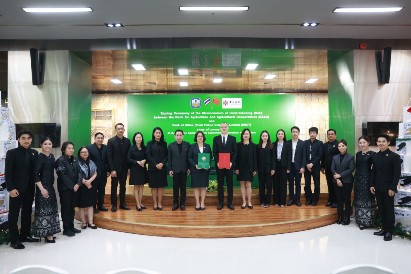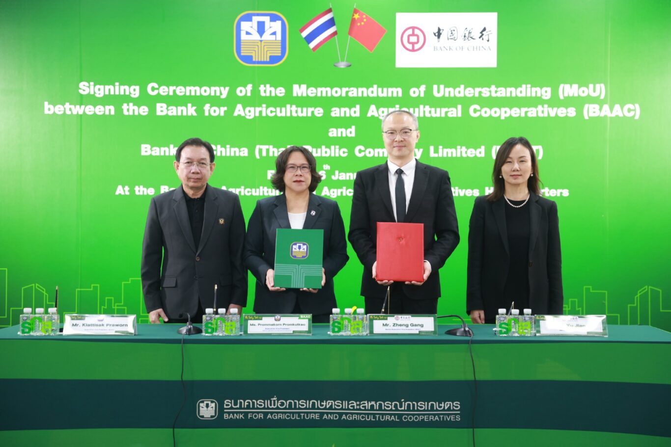 นางสาวพรหมกร พรหมขัติแก้ว ผู้ช่วยผู้จัดการธนาคารเพื่อการเกษตรและสหกรณ์การเกษตร (ธ.ก.ส.) พร้อมด้วย Mr. Zheng Gang, Senior, Executive Vice president, BOCT ร่วมพิธีลงนามบันทึกความเข้าใจระหว่าง ธ.ก.ส. และ ธนาคารแห่งประเทศจีน (ไทย) จำกัด (มหาชน) หรือ Bank of China (Thai) Public Company Limited (BOCT) เพื่อขับเคลื่อนความร่วมมือที่มุ่งเน้นการพัฒนาบริการทางการเงิน การสนับสนุนสินเชื่อเพื่อธุรกิจ การอำนวยความสะดวกด้านธุรกรรมข้ามพรมแดน รวมถึงการแลกเปลี่ยนองค์ความรู้และเครือข่ายทางธุรกิจ เพื่อรองรับการขยายตัวของการลงทุนและการค้าระหว่างไทยและจีนในอนาคต