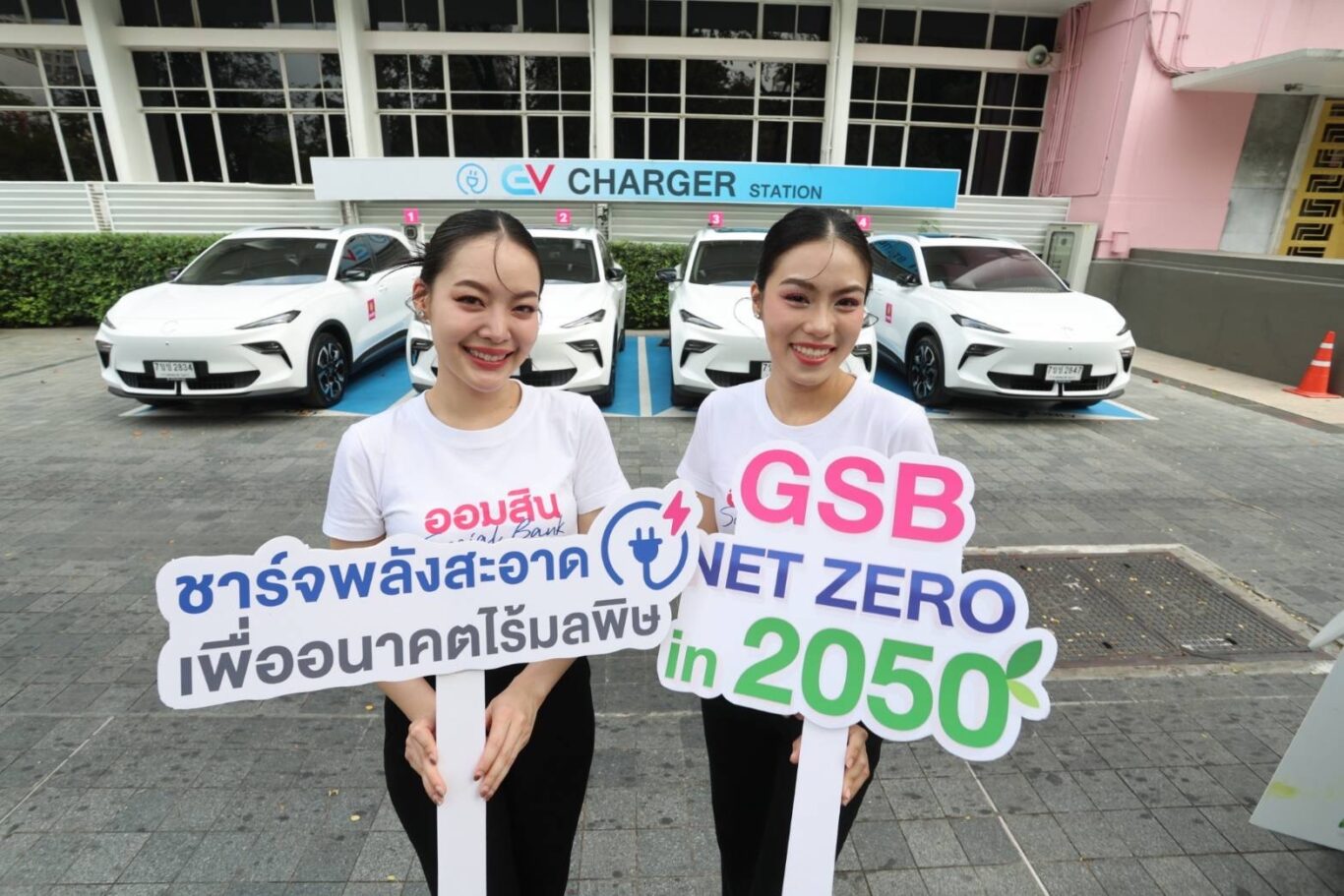 นางสาววชิรา การสุทธิ์ รองผู้อำนวยการธนาคารออมสิน กลุ่มการตลาดเพื่อความยั่งยืน และ นางญดาภรณ์ ศรีพัฒน์ รองผู้อำนวยการธนาคารออมสิน กลุ่มปฏิบัติการ พร้อมคณะผู้บริหาร รับมอบรถยนต์ไฟฟ้าล็อตใหม่สำหรับใช้ในภารกิจของธนาคารออมสิน สำนักงานใหญ่ กรุงเทพฯ ตามแผนการดำเนินงานเพื่อมุ่งสู่เป้าหมายการปล่อยก๊าซเรือนกระจกสุทธิเป็นศูนย์ หรือ GSB Net Zero Roadmap ภายในปี 2050 ซึ่งภายใต้แผนดังกล่าวธนาคารตั้งเป้าหมายการเปลี่ยนมาใช้รถยนต์ไฟฟ้า ทดแทนการใช้รถเครื่องยนต์สันดาปในการปฏิบัติงานให้ครบทั้งที่สำนักงานใหญ่ และในภารกิจของสายงานกิจการสาขาทุกภูมิภาคทั่วประเทศ ภายในปี 2030