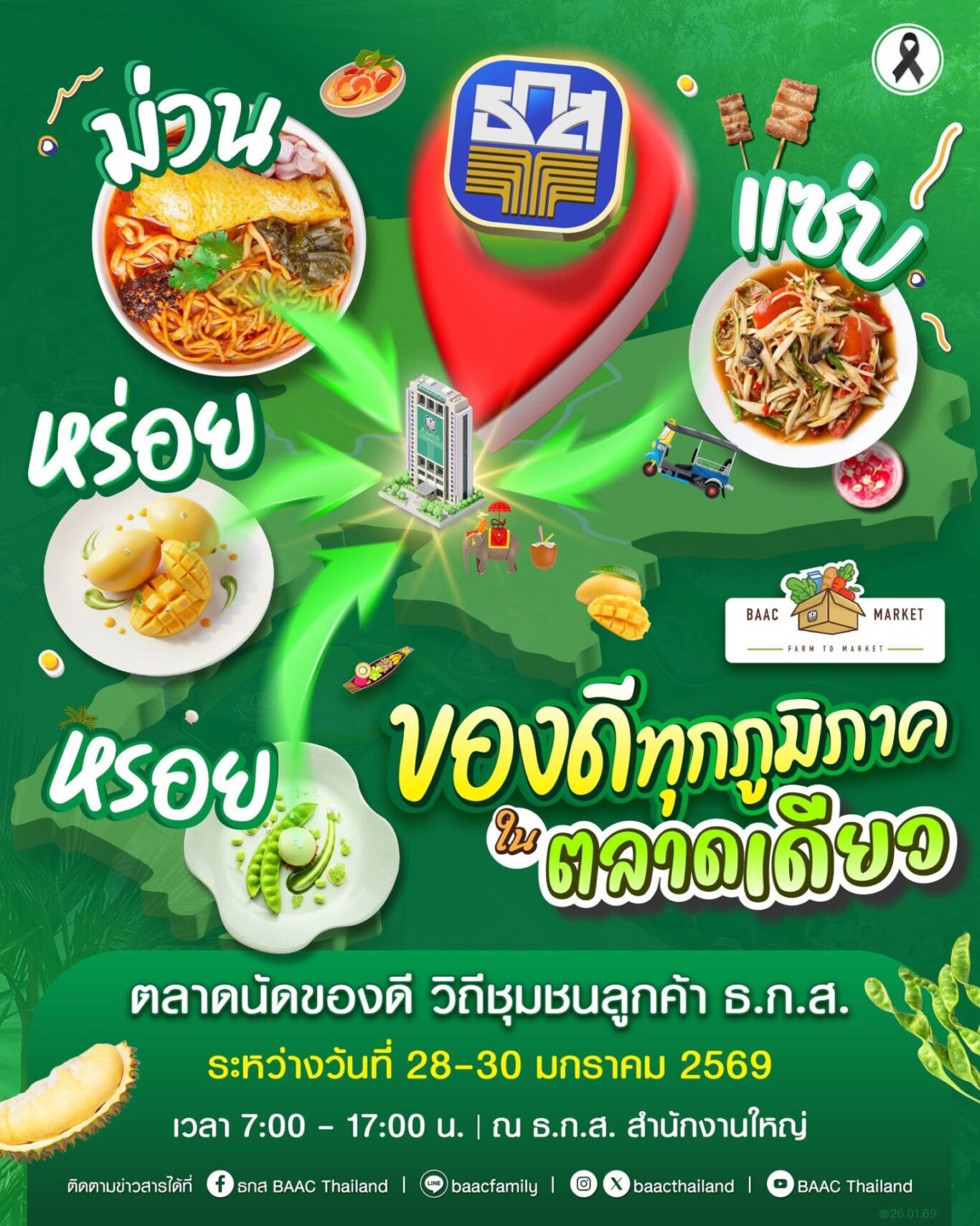 ธ.ก.ส. ยกขบวนสินค้าเกษตร สินค้าชุมชน และผลิตภัณฑ์แปรรูปคุณภาพ ที่มีเอกลักษณ์เฉพาะถิ่น ส่งตรงจากเกษตรกรและผู้ประกอบการ ลูกค้า ธ.ก.ส. ถึงมือผู้บริโภคโดยตรงกว่า 60 ร้านค้าทั่วทุกภูมิภาค รวมไว้ในงานตลาดนัดของดีวิถีชุมชน ภายใต้ธีม “ของดีภูมิภาค” ระหว่างวันที่ 28 – 30 มกราคม 2569 ณ บริเวณด้านหน้า ธ.ก.ส. สำนักงานใหญ่ กรุงเทพ