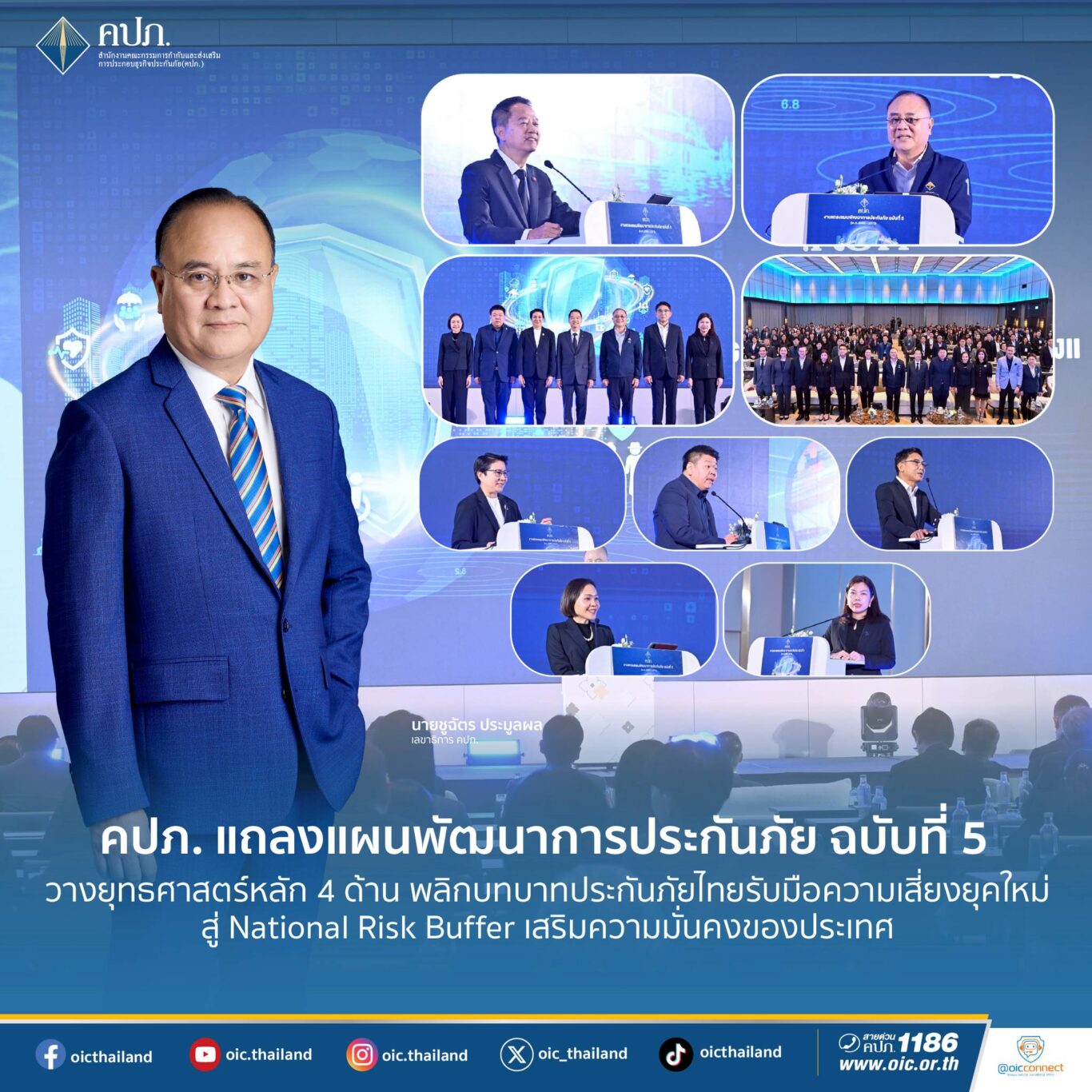 เมื่อวันที่ 3 กุมภาพันธ์ 2569 สำนักงานคณะกรรมการกำกับและส่งเสริมการประกอบธุรกิจประกันภัย (สำนักงาน คปภ.) จัดงานแถลงแผนพัฒนาการประกันภัย ฉบับที่ 5 (พ.ศ. 2569 – 2573) เพื่อสรุปภาพรวมการขับเคลื่อนทิศทางการพัฒนาอุตสาหกรรมประกันภัยไทยในระยะต่อไป ซึ่งได้รับเกียรติจาก นายบุณยฤทธิ์ กัลยาณมิตร กรรมการผู้ทรงคุณวุฒิด้านการประกันภัย และประธานอนุกรรมการขับเคลื่อนแผนพัฒนาการประกันภัย กล่าวปาฐกถาพิเศษ เรื่อง “บทบาทของระบบประกันภัยในการบริหารความเสี่ยงภัยของประเทศ และ นายชูฉัตร ประมูลผล เลขาธิการคณะกรรมการกำกับและส่งเสริมการประกอบธุรกิจประกันภัย (เลขาธิการ คปภ.) กล่าวสรุปภาพรวมการขับเคลื่อนแผนพัฒนาการประกันภัย โดยมี นายสุรินทร์ ตนะศุภผล ผู้ช่วยเลขาธิการ สายกลยุทธ์องค์กร กล่าวรายงานวัตถุประสงค์การจัดงาน