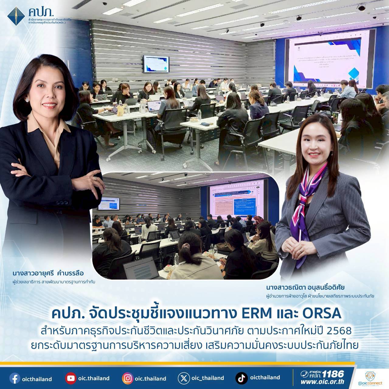 เมื่อวันที่ 16 กุมภาพันธ์ 2569 สำนักงานคณะกรรมการกำกับและส่งเสริมการประกอบธุรกิจประกันภัย (สำนักงาน คปภ.) จัดการประชุมชี้แจงแนวทางการจัดทำรายงานการบริหารความเสี่ยงแบบองค์รวม (Enterprise Risk Management : ERM) และการประเมินความเสี่ยงและความมั่นคงทางการเงิน (Own Risk and Solvency Assessment : ORSA) ตามประกาศสำนักงาน คปภ. หลักเกณฑ์ วิธีการ และแนวทางการจัดทำรายงานการบริหารความเสี่ยงแบบองค์รวม (ERM) และการประเมินความเสี่ยงและความมั่นคงทางการเงินของบริษัทประกันชีวิต/วินาศภัย (ORSA) พ.ศ. 2568 สำหรับภาคธุรกิจประกันชีวิตและภาคธุรกิจประกันวินาศภัย โดยมี นางสาวอายุศรี คำบรรลือ ผู้ช่วยเลขาธิการ สายพัฒนามาตรฐานการกำกับ เป็นประธานเปิดการประชุม พร้อมด้วยผู้แทนบริษัทประกันชีวิตและบริษัทประกันวินาศภัยเข้าร่วมรับฟัง ณ ห้องประชุมสถาบันวิทยาการประกันภัยระดับสูง สำนักงาน คปภ. ถนนรัชดาภิเษก กรุงเทพมหานคร