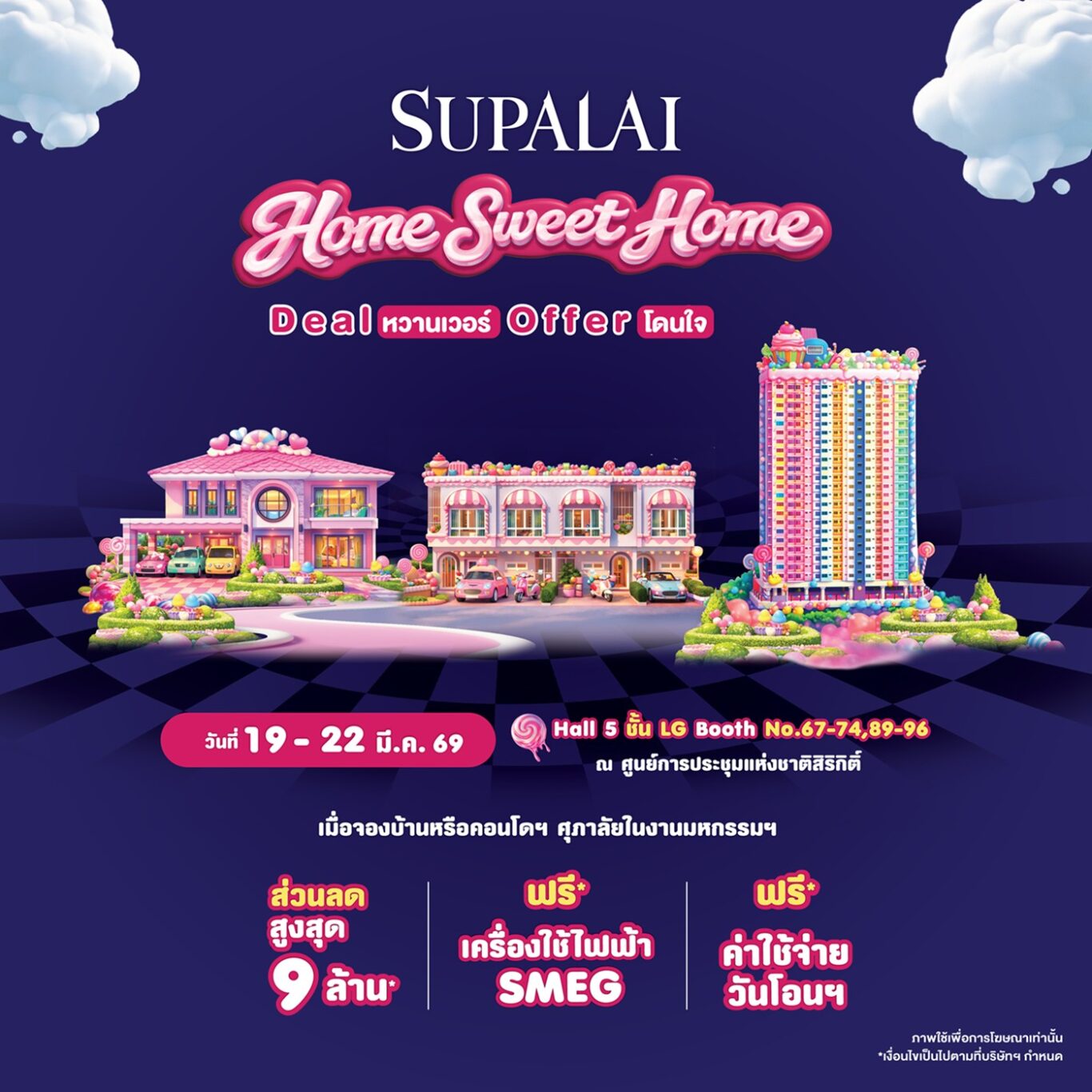 บริษัท ศุภาลัย จำกัด (มหาชน) ชวนคนอยากมีบ้านมาเติมเต็มความสุขกับแคมเปญสุดฟิน “SUPALAI HOME SWEET HOME” Deal หวานเวอร์ Offer โดนใจ ยกทัพบ้าน ทาวน์โฮม และคอนโดมิเนียมพร้อมอยู่กว่า 200 โครงการ ฮอตทุกระดับราคา ทำเลยอดฮิต บุกงานมหกรรมบ้านและคอนโดฯ ครั้งที่ 49 พร้อมดีลดีหวานเวอร์ ส่วนลดสูงสุด 9,000,000 บาท* รับฟรี! เครื่องใช้ไฟฟ้า SMEG* และฟรี! ค่าใช้จ่ายวันโอนฯ* ฟินต่อเนื่องดีลพิเศษ Shock Price! เริ่ม 990,000 บาท* จัดเต็มเพียง 4 วันเท่านั้น! 19-22 มีนาคม 2569 ณ ศูนย์การประชุมแห่งชาติสิริกิติ์ Hall 5 ชั้น LG บูธที่ 67-74/89-96