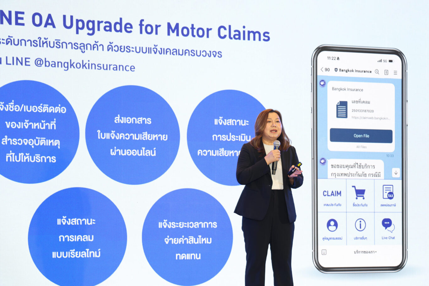 • LINE OA Upgrade for Motor Claims ยกระดับการให้บริการลูกค้าด้วยระบบแจ้งเคลมรถยนต์แบบครบวงจรผ่าน LINE @bangkokinsurance เพื่อเพิ่มความสะดวก รวดเร็ว และเสริมความอุ่นใจให้แก่ลูกค้า โดยสามารถรับทราบข้อมูลสำคัญต่างๆ จากการเคลมประกันภัยรถยนต์ได้อย่างต่อเนื่อง เช่น การแจ้งชื่อและเบอร์โทรศัพท์ของเจ้าหน้าที่สำรวจอุบัติเหตุที่จะเดินทางเข้าไปดูแล การส่งเอกสารใบแจ้งความเสียหายผ่านช่องทางออนไลน์ การแจ้งสถานะการประเมินความเสียหายของรถยนต์ ตลอดจนการติดตามสถานะการเคลมแบบเรียลไทม์ พร้อมทั้งแจ้งระยะเวลาการซ่อมและการจ่ายค่าสินไหมทดแทน นอกจากนี้ บริษัทฯ อยู่ระหว่างการพัฒนา LINE OA for Partners เพื่อช่วยอำนวยความสะดวกและสนับสนุนการทำงานของตัวแทนและนายหน้า ให้มีความคล่องตัวและบริหารจัดการได้ดียิ่งขึ้น ซึ่งจะนำไปสู่การดูแลลูกค้าได้อย่างรวดเร็วและเต็มประสิทธิภาพ