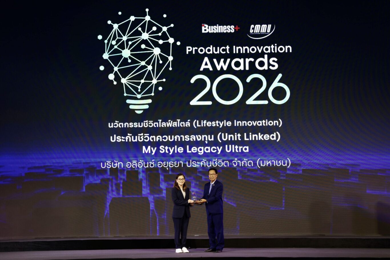 บมจ. อลิอันซ์ อยุธยา ประกันชีวิต นำโดย นางสาวพบพร พิพัฒน์สาธุกิจ ผู้อำนวยการอาวุโส ฝ่ายธุรกิจยูนิต ลิงค์ คว้ารางวัล “สุดยอดนวัตกรรมสินค้าและบริการแห่งปี พ.ศ. 2569 BUSINESS+ PRODUCT INNOVATION AWARDS 2026 กลุ่มนวัตกรรมชีวิตไลฟ์สไตล์ ผลิตภัณฑ์ประกันชีวิตควบการลงทุน (Unit Linked) “My Style Legcy ULTRA” ผลิตภัณฑ์ที่ออกแบบมาเพื่อตอบโจทย์ลูกค้ากลุ่มไฮเน็ตเวิร์ธ วางแผนการส่งต่อความมั่งคั่งที่มั่นคงให้คนที่รัก ความคุ้มครองชีวิตเริ่มต้น 10 ล้านบาท และสามารถเพิ่มโอกาสรับผลตอบแทนสูงขึ้นผ่านการ Top-Up วางแผนได้ตามเป้าหมาย มีความยืดหยุ่นในปรับเพิ่มลดความคุ้มครองชีวิต เป็นอีกหนึ่งแผนประกันจาก Ultra series ที่ได้รับเสียงตอบรับที่ดีอย่างมาก โดยได้รับเกียรติจาก ฯพณฯ นุรักษ์ มาประณีต องคมนตรี เป็นประธานมอบรางวัล ณ ห้องบอลรูม โรงแรมอินเตอร์คอนติเนนตัล กรุงเทพ