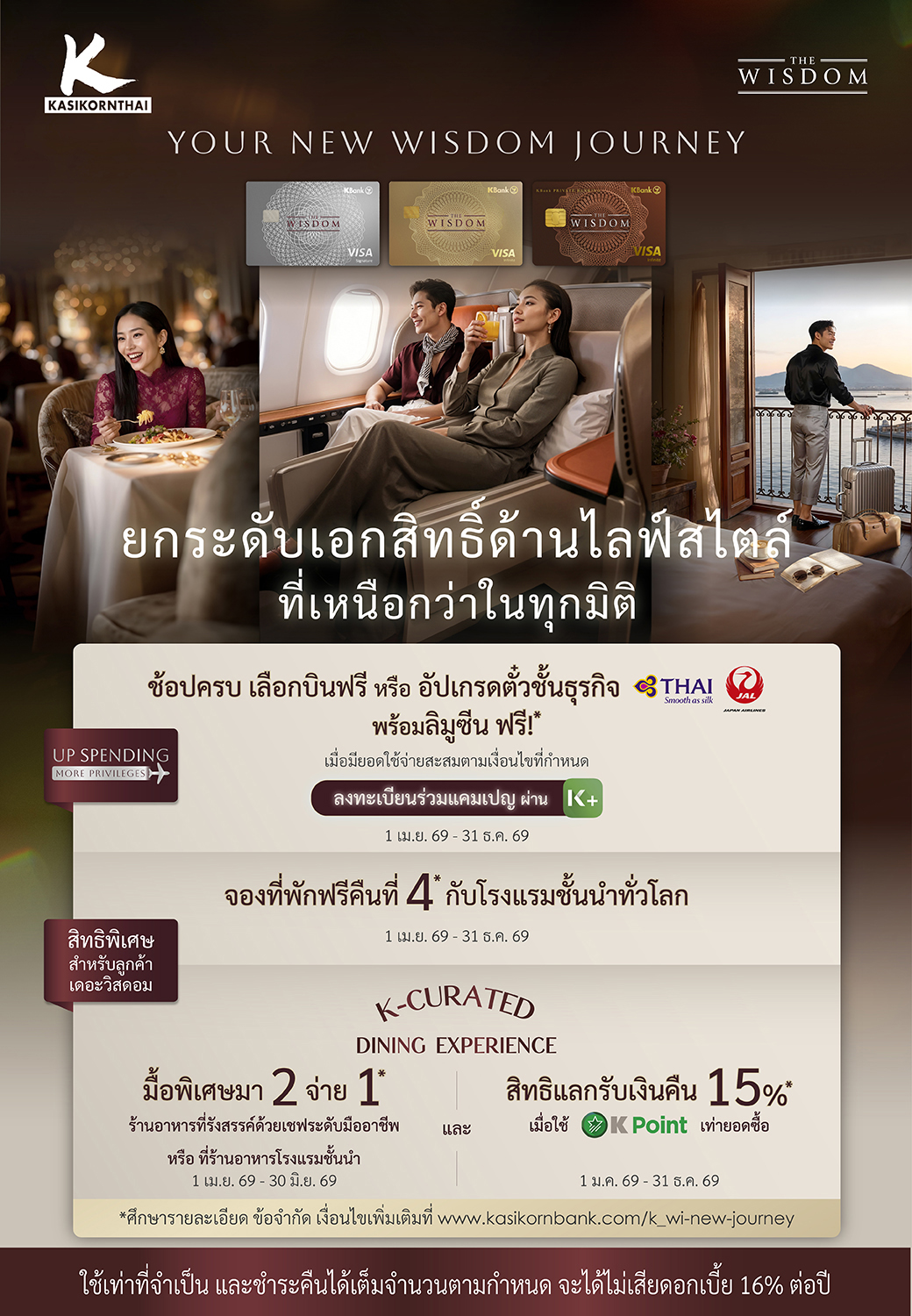 เดอะวิสดอมกสิกรไทย* (KBank THE WISDOM) เดินหน้าสู่ก้าวใหม่ของการยกระดับสิทธิพิเศษด้วยบัตรเครดิตเดอะวิสดอมกสิกรไทย ภายใต้แนวคิด “Your New WISDOM Journey” พร้อมอัปเกรดประสบการณ์ให้ตอบโจทย์ไลฟ์สไตล์ที่หลากหลายและมีความหมายยิ่งขึ้น จับมือกับ วีซ่า (Visa) มอบประสบการณ์เอ็กซ์คลูซีฟ ครอบคลุมทั้งการเดินทาง การพักผ่อน และการใช้ชีวิตระดับลักชูรี ผ่านแคมเปญ “UP SPENDING, MORE PRIVILEGES”