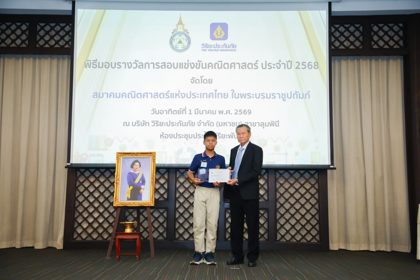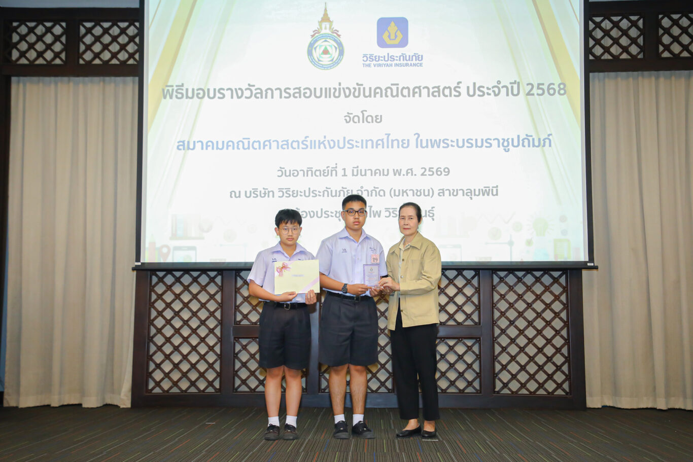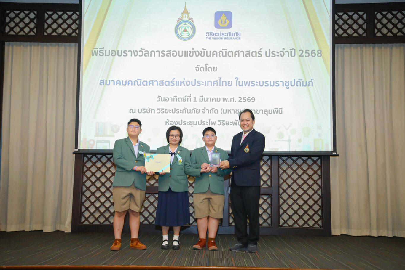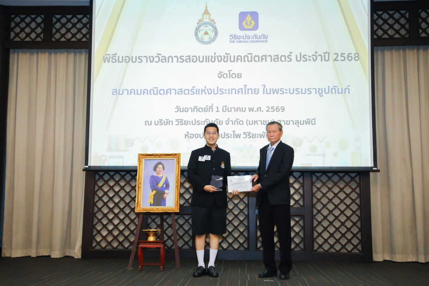 นายประสาน นิลมานัตต์ กรรมการและที่ปรึกษา บริษัท วิริยะประกันภัย จำกัด (มหาชน) ให้เกียรติเป็นประธานใน “พิธีมอบรางวัลการสอบแข่งขันคณิตศาสตร์ ประจำปี 2568” ในโอกาสที่บริษัทฯ ร่วมสนับสนุน “สมาคมคณิตศาสตร์แห่งประเทศไทย ในพระบรมราชูปถัมภ์” จัดการสอบแข่งขันคณิตศาสตร์ สำหรับนักเรียนชั้นประถมศึกษา มัธยมศึกษาตอนต้น และมัธยมศึกษาตอนปลาย ในระดับประเทศและระดับภูมิภาค พร้อมสนับสนุนเงินรางวัลสำหรับนักเรียนที่ได้รับรางวัลที่มีคะแนนสูงสุด ทั้งประเภทบุคคล และประเภททีม รวมจำนวนทั้งสิ้น 250,000 บาท เพื่อเป็นการเชิดชูเกียรติและเสริมสร้างแรงบันดาลใจทางการเรียนรู้ต่อไปในอนาคต