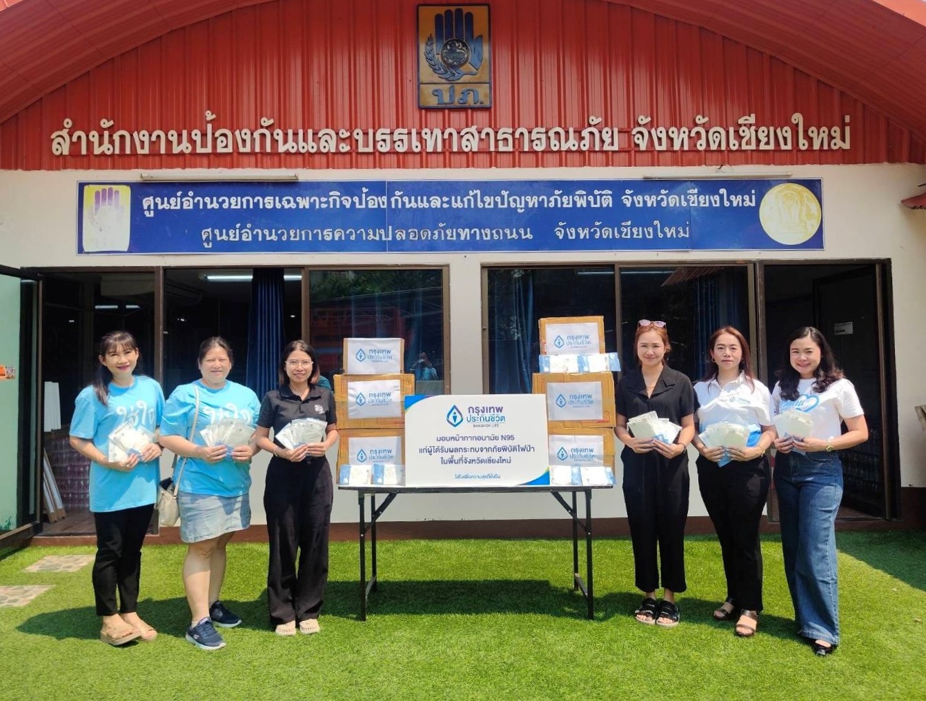 บริษัท กรุงเทพประกันชีวิต จำกัด (มหาชน) เดินหน้าสานต่อพันธกิจองค์กร ส่งมอบความใส่ใจ และห่วงใยแก่ผู้ได้รับผลกระทบจากภัยพิบัติไฟป่า โดยพนักงานและตัวแทนประกันชีวิตในพื้นที่จังหวัดเชียงใหม่ เป็นตัวแทนมอบหน้ากากอนามัยมาตรฐาน N95 จำนวน 1,000 ชิ้น ให้แก่ สำนักงานป้องกันและบรรเทาสาธารณภัย จังหวัดเชียงใหม่ (ปภ.) เพื่อเร่งกระจายความช่วยเหลือแก่เจ้าหน้าที่อาสาดับไฟป่า และบรรเทาความเดือดร้อนของประชาชนกลุ่มเปราะบางที่ต้องเผชิญกับค่าฝุ่นละอองขนาดเล็ก PM 2.5 ที่สูงเกินค่ามาตรฐาน ซึ่งส่งผลกระทบโดยตรงต่อระบบทางเดินหายใจและสุขภาพในระยะยาว ณ สำนักงานป้องกันและบรรเทาสาธารณภัย จังหวัดเชียงใหม่