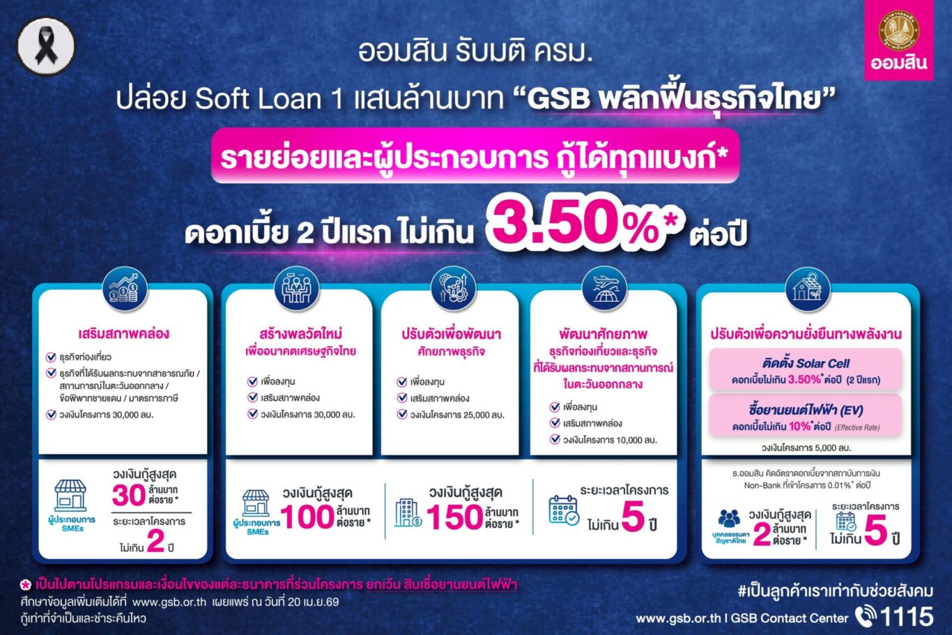 โครงการสินเชื่อดอกเบี้ยต่ำ (Soft Loan) “GSB พลิกฟื้นธุรกิจไทย” วงเงินโครงการรวม 100,000 ล้านบาท ธนาคารออมสินให้วงเงินสินเชื่อดอกเบี้ยต่ำมากแก่สถาบันการเงินและผู้ให้บริการทางการเงินอื่น ๆ ที่ไม่ใช่สถาบันการเงิน (Non – Bank) ที่เข้าร่วมโครงการ เพื่อให้ทุกรายนำวงเงินสินเชื่อนั้นไปปล่อยกู้ต่อให้กับลูกค้ารายย่อย ผู้ประกอบการ SMEs และธุรกิจขนาดใหญ่ ในอัตราดอกเบี้ย 2 ปีแรก ไม่เกิน 3.50% ต่อปี โดยเป็นไปตามโปรแกรมและเงื่อนไขที่แต่ละธนาคารกำหนด (*ยกเว้นการกู้ซื้อรถ EV) ใน 3 วัตถุประสงค์หลัก คือ