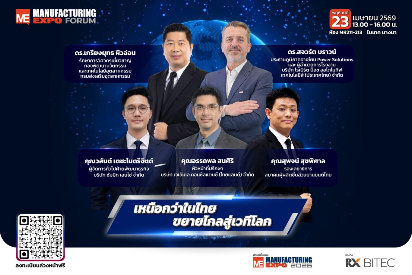 • Manufacturing Expo Forum: “เหนือกว่าในไทย ขยายไกลสู่เวทีโลก” โอกาสเดียวที่จะได้เจาะลึกกลยุทธ์การปรับตัวสู่การเป็น Global Supplier ท่ามกลางการเปลี่ยนผ่านครั้งใหญ่ของอุตสาหกรรม ที่จะไขข้อข้องใจในประเด็น : เทคโนโลยีสำคัญที่โรงงานทั่วโลกกำลังเร่งลงทุน – เกณฑ์การเลือกซัพพลายเออร์ของกลุ่ม OEM ระดับโลก