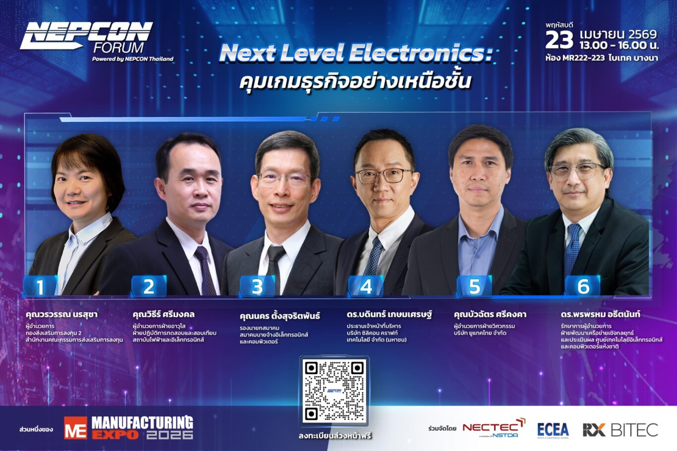• NEPCON Forum: “Next Level Electronics: คุมเกมธุรกิจอย่างเหนือชั้น” – เพื่อรับทราบนโยบายส่งเสริมการลงทุนจากภาครัฐ และเจาะลึกภาพรวมทั้งในระดับประเทศและระดับสากล ผ่านการเสวนาระหว่างผู้บริหารหน่วยงานชั้นนำ ที่จะทำให้การเชื่อมต่อโอกาสของผู้ผลิตอิเล็กทรอนิกส์ไทยกับห่วงโซ่อุทานโลกไม่ใช่เรื่องไกลเกินเอื้อม ห้อง MR 222 – 223