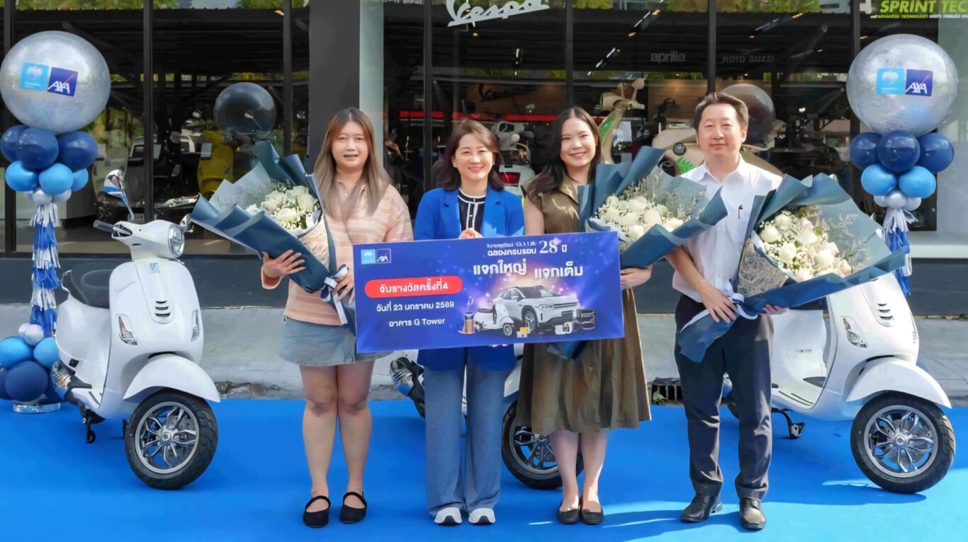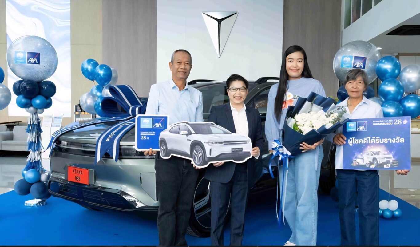 บมจ.กรุงไทย-แอกซ่า ประกันชีวิต นำโดย บุปแผาวดี โอวรารินท์ ประธานเจ้าหน้าที่บริหาร ฝ่ายการตลาด (คนที่ 2 จากซ้าย) มอบรางวัลใหญ่ รถยนต์ DEEPAL E07 Performance AWD พร้อมอุปกรณ์ชาร์จไฟ มูลค่า 1,999,000 บาท ให้แก่ ภัทราวดี ขวัญยืน (คนที่ 3 จากซ้าย) ลูกค้าผู้โชคดีจากแคมเปญ “ฉลองครบรอบ 28 ปี กรุงไทย-แอกซ่า แจกใหญ่ แจกเต็ม” ณ ศูนย์บริการ ดีพอล อิเลคตร้า ออโตโมบิล ประดิษฐ์มนูธรรม